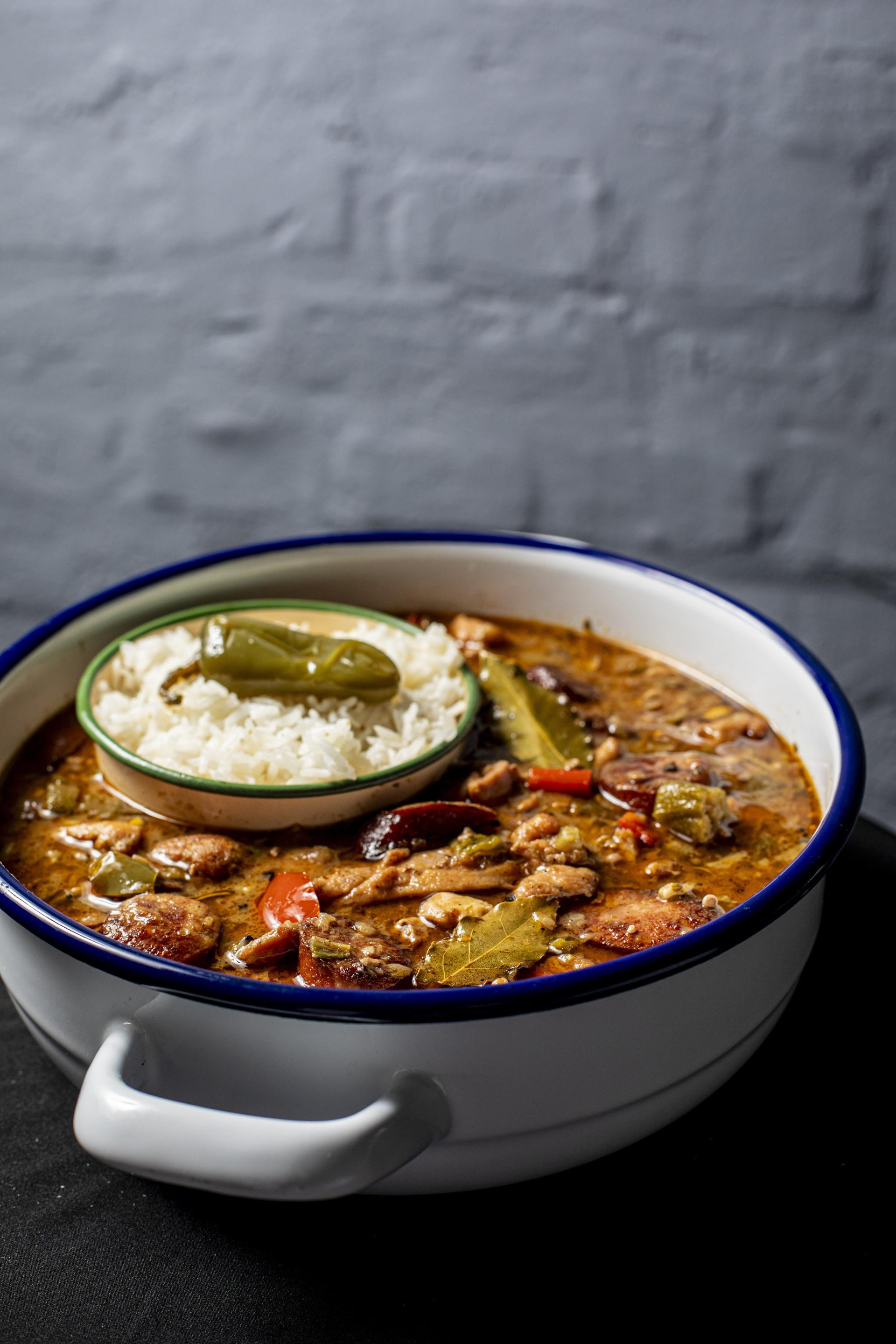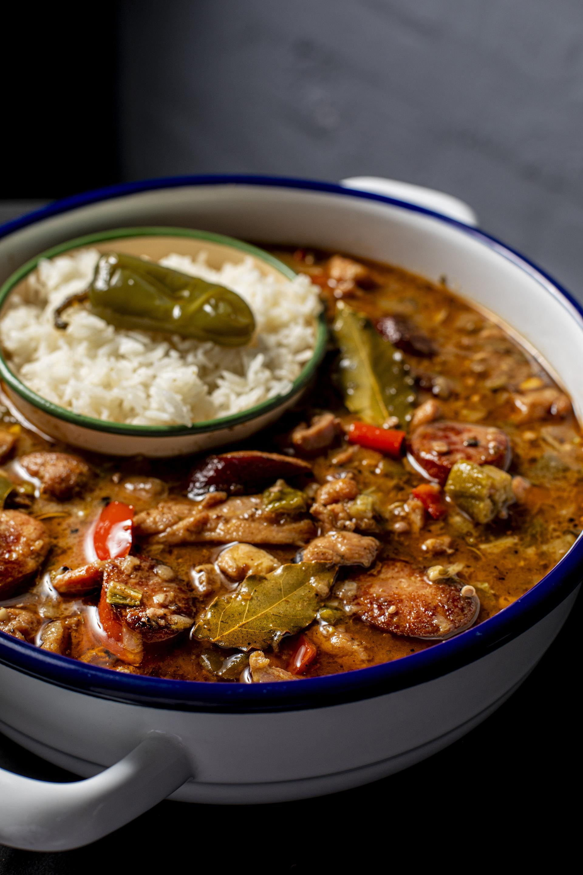 Kod pripreme rouxa važno je da imate sve sastojke unaprijed pripremljene i da ste koncentrirani jer može izgorjeti u sekundi. Kad je roux gotov, ubacite luk, paprike i celer. Pirjajte 5–7 minuta dok povrće ne omekša. Dodajte češnjak i pirjajte još minutu. U međuvremenu pećnicu zagrijte na 220 °C. Vratite kobasicu i piletinu, umiješajte sve začine, dolijte temeljac da sve prekrije i uskladite okuse. Lonac stavite u pećnicu i kada lagano zavrije, poklopite ga, smanjite temperaturu na 165-170 °C i kuhajte poklopljeno oko 2 sata. Izvadite van i otklopite. Ako ima previše masnoće, pažljivo odstranite dio s vrha, dodajte bamiju koju ste izrezali na 5 cm debele “zvjezdice”. Poklopite i vratite u pećnicu – smanjite temperaturu na 160 °C i kuhajte narednih 60 minuta. Otklopite i kuhajte po želji još oko 45-60 minuta dok se malo ne ugusti. Prohladite i poslužite s rižom i nasjeckanim peršinom.