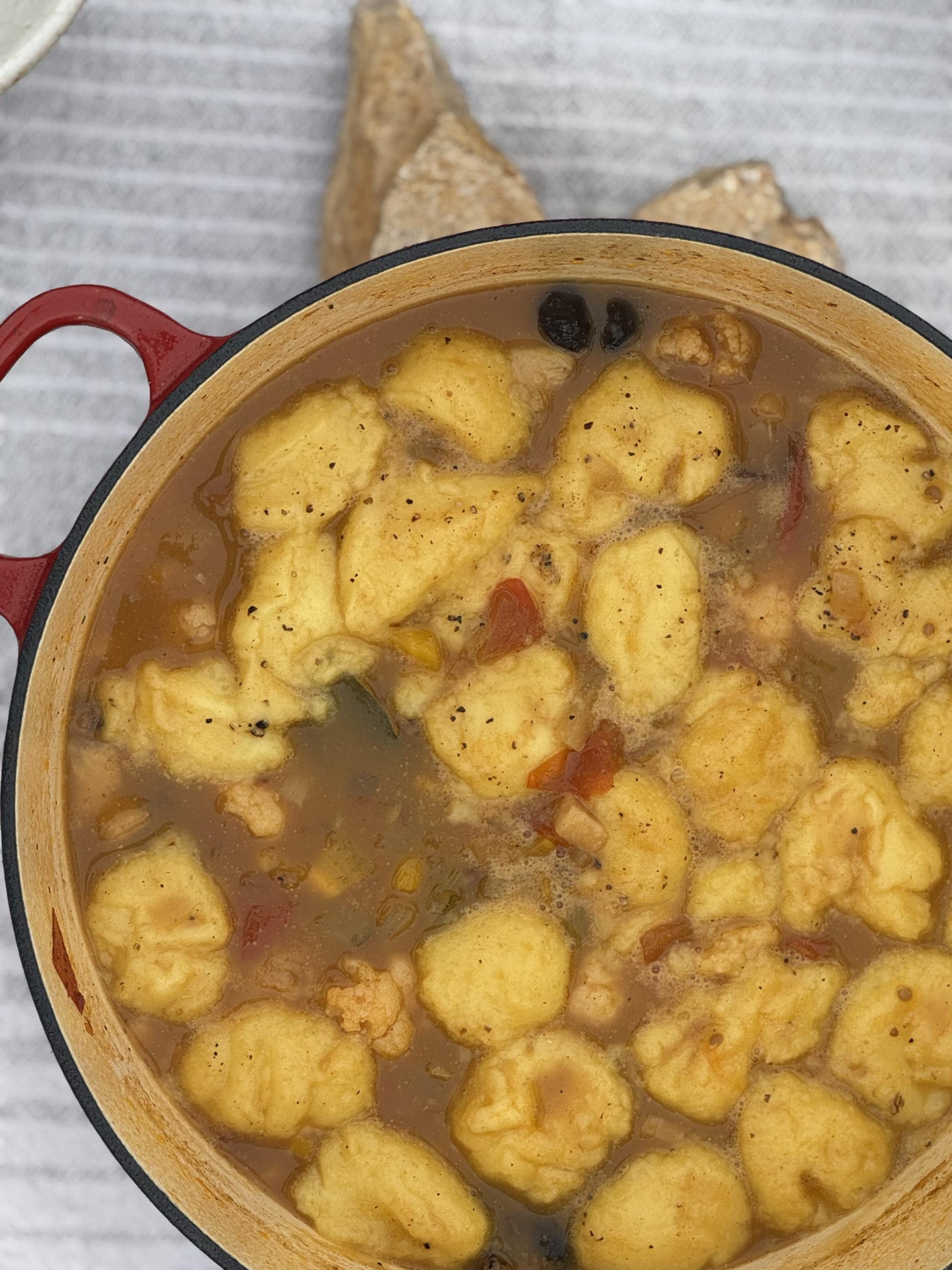 Na malo ulja popržite crveni luk i papriku dok ne omekšaju i lagano se karameliziraju. Dodajte češnjak, kurkumu, kajensku papriku i kumin, kratko propirjajte da puste miris. Umiješajte mrkvu, tikvicu i kelj, pirjajte nekoliko minuta. Dodajte rajčicu i nastavite pržiti dok tekućina ne ispari i sve se poveže. Ulijte povrtni temeljac i pustite da prokuha. Kad zakuha, dodajte cvjetaču i slanutak, kuhajte dok povrće ne omekša. Žličicom ubacujte male komadiće krumpirovog tijesta (Rildok njoke) i kuhajte još par minuta, dok ne isplivaju. Umiješajte miso pastu, lagano promiješajte i ne dopustite da prejako prokuha. Za kraj, dodajte par kapi domaćeg čili ulja – ono daje varivu toplinu i karakter. Pospite svježim peršinom i poslužite toplo.