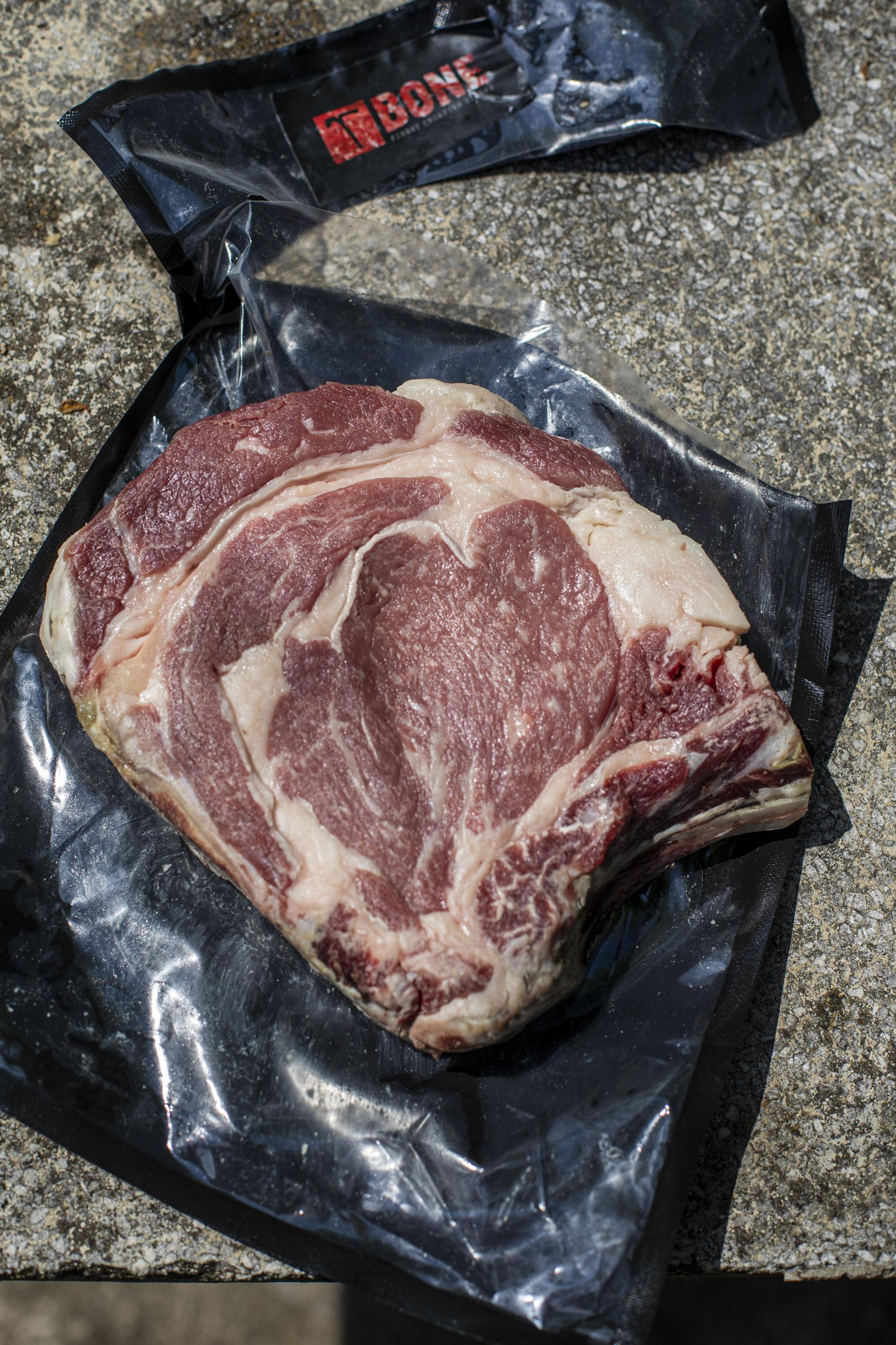 Rib steak je zapravo jedan od najukusnijih i najfinijih komada mesa s goveda - isto što i rib eye, samo s kosti, odnosno dijelom rebra. Ovaj naš - a odabrali smo najmasniji, od black angusa - težak je oko kilograma. Iako nam se čini da na kost otpada možda petina ukupne težine, cijena mu je znatno niža od cijene rib eyea - 38 eura za kilogram u odnosu na 58,50 eura koliko stoji rib eye. Naš steak dio je T Boneove ponude Dry aged baby beef, što znači da je od mesa junice stare između 12 i 24 mjeseca, odležane 45 dana u uvjetima suhog zrenja. Inače, kao Baby beef, odnosno fiorentina, starosti do 16 mjeseci i odležan do 21 dan, prepoznatljiv po svojoj svjetlijoj crvenoj boji, isti se komad prodaje po 25 eura za kilogram.