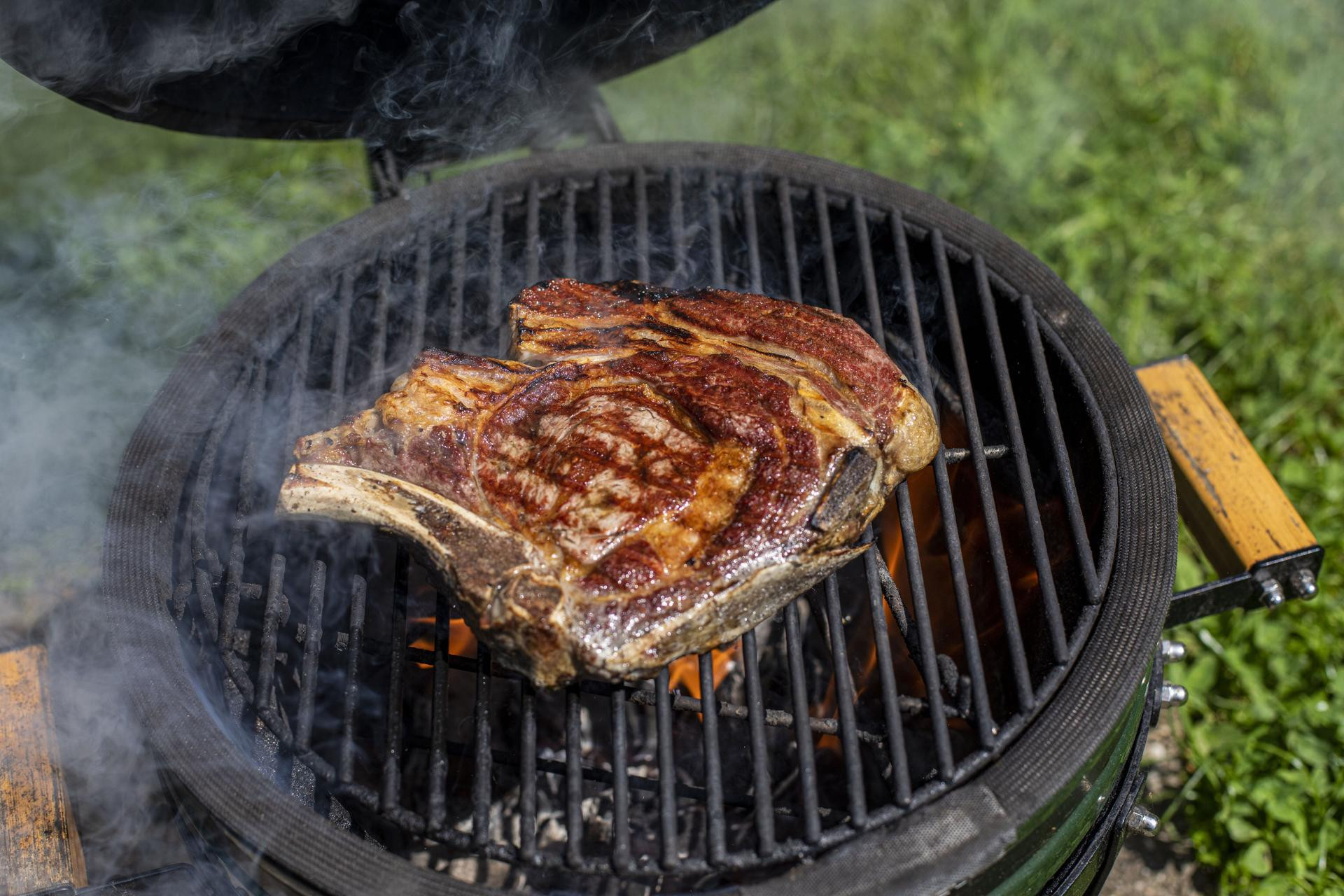 Vatreni doček nakon prvog podizanja poklopca bio je očekivan: otopljena masnoća raspalila je plamen, ali ni tu nema brige - osim što je trenutačno podignuo temperaturu, plamen će se stišati čim okrenemo steak i spustimo poklopac. U prolaznom vremenu naš rib steak izgledao je i mirisao da ne može bolje. Još samo tri minute…