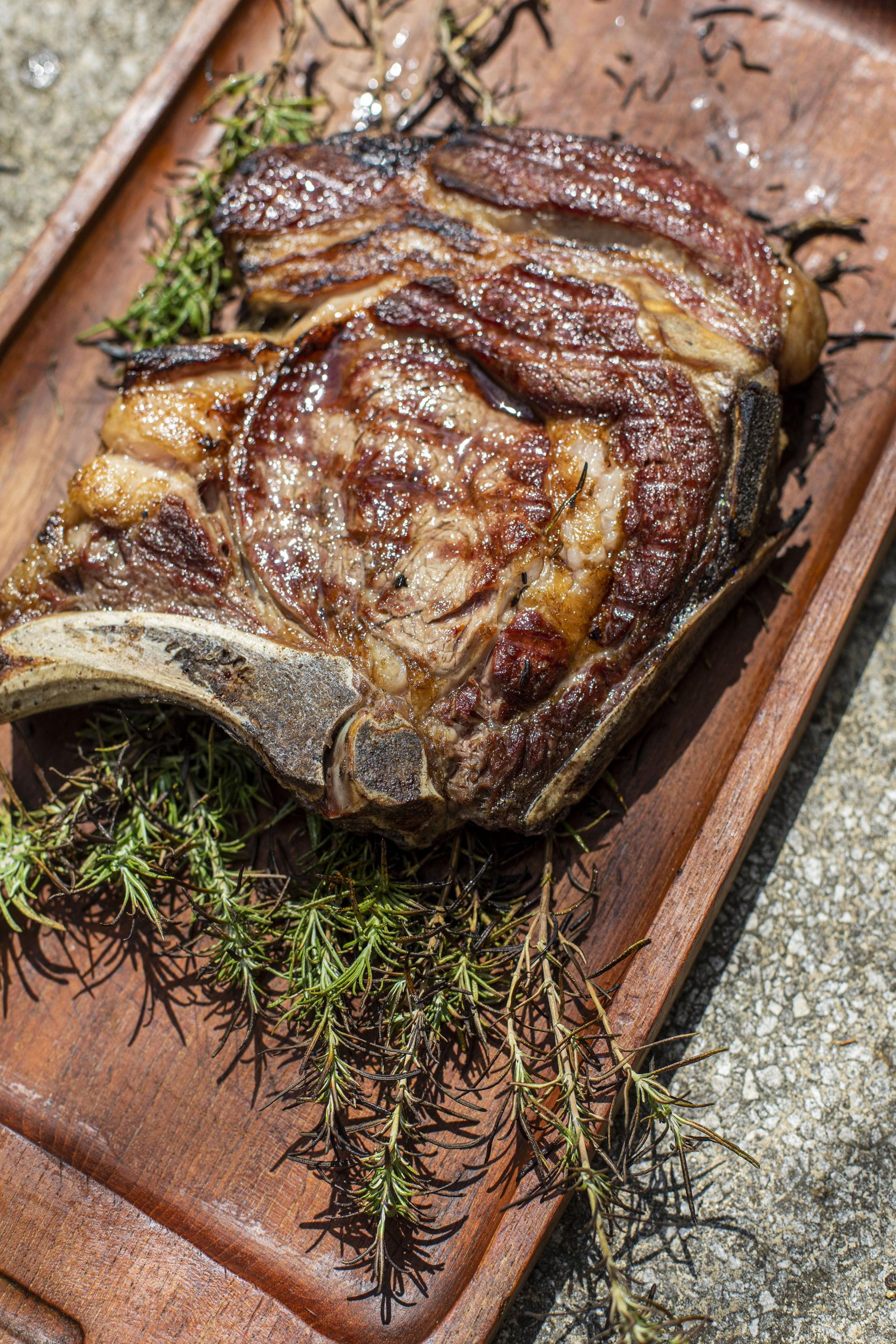 U T Boneu u prodaji je isključivo odležano meso (do čak 90 dana, Dry aged premium beef) junica iz vlastitog uzgoja, hranjenih najkvalitetnijom kombinacijom žitarica s hrvatskih polja. Ako netko ima kakvih dvojbi oko marinada, suhih ili mokrih, neka se ne zamara time: ništa ovom komadu ne treba. Nismo ga čak ni solili prije polaganja na vruću rešetku našeg kamado roštilja, zagrijanog na oko 250 stupnjeva. Samo smo ga prije toga prijateljski pljesnuli, potapšali, i rastali se na četiri minute.