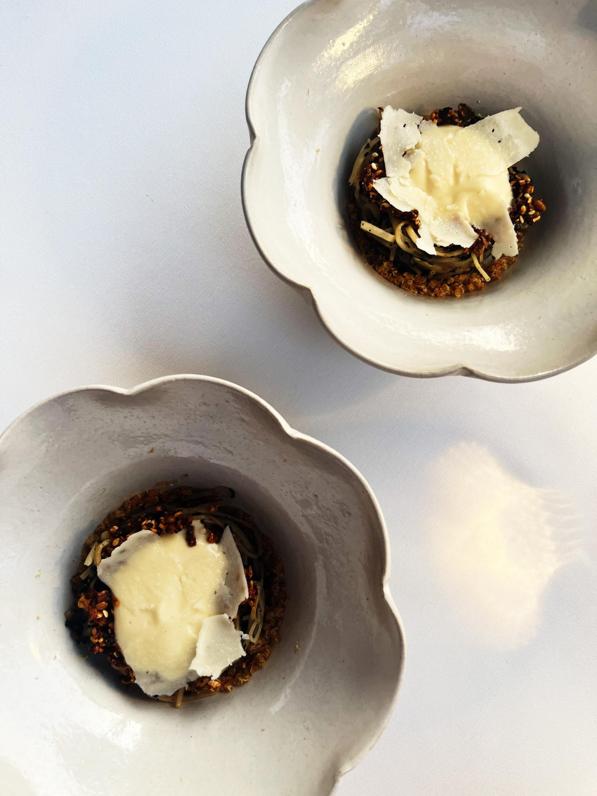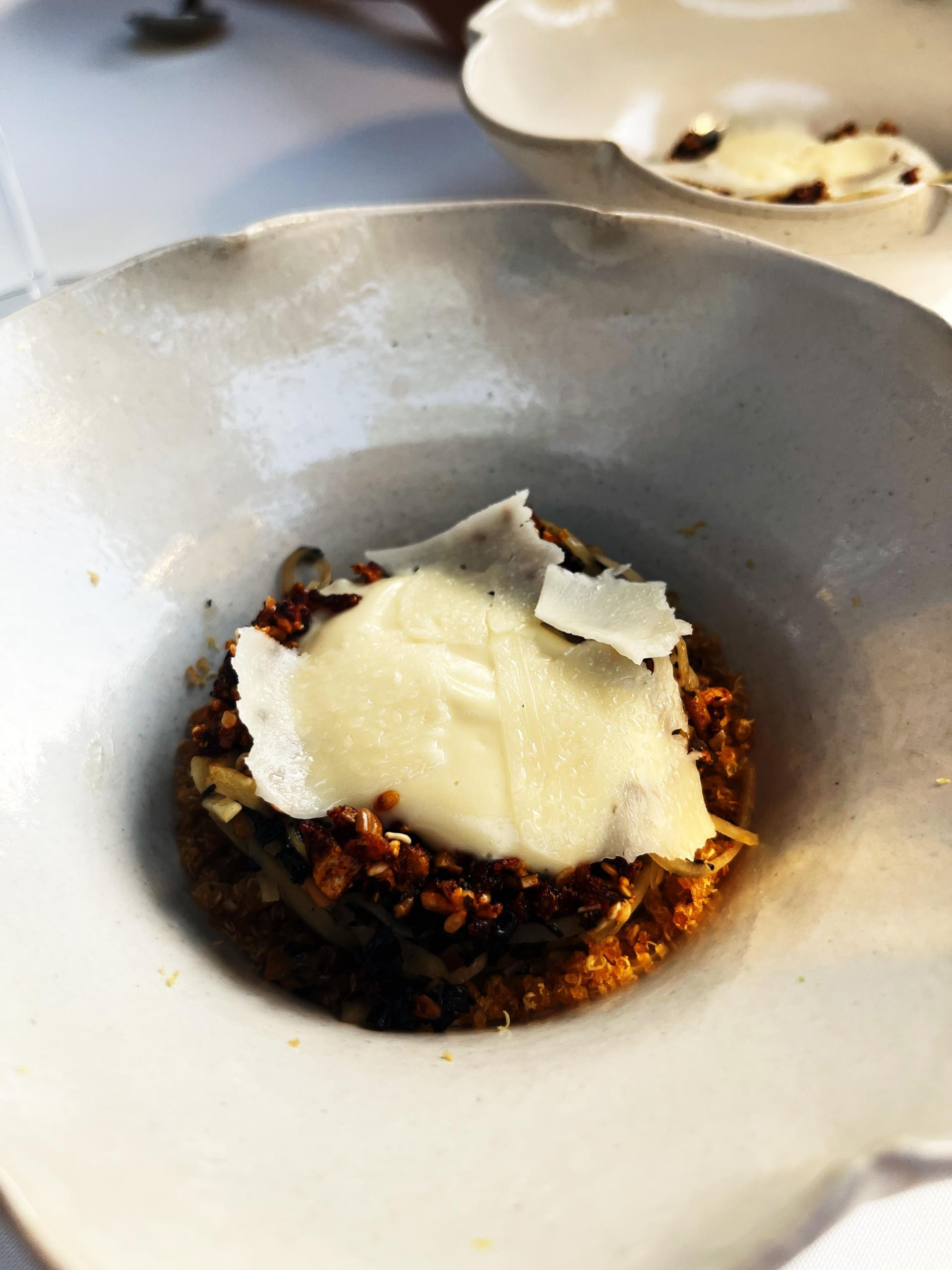 Kako nam je to za vrijeme naše večere lijepo prezentiralo osoblje, i to ni manje ni više nego još jedan biser iz ManO2 restorana, veliki profesionalac Alen Matić, pastrnjak u kuhinji najprije režu na julienne, tako da imitira špagete, zatim ga kuhaju sous vide u vlastitom soku, vade iz vrećice pa stavljaju u tavu, gdje ga spajaju s duxelleom od crnih truba, a potom na tanjuru sastavljaju s ostatkom elemenata. Tu je domaći chili crunch, hrskava kvinoja i, kao da već sve to nije bilo dovoljno, dodaju i sirni umak, i to od francuskog Comtea i mladog paškog sira, pa sve zaokružuju s malo sira iz mišine, odležanog godinu i dva mjeseca.