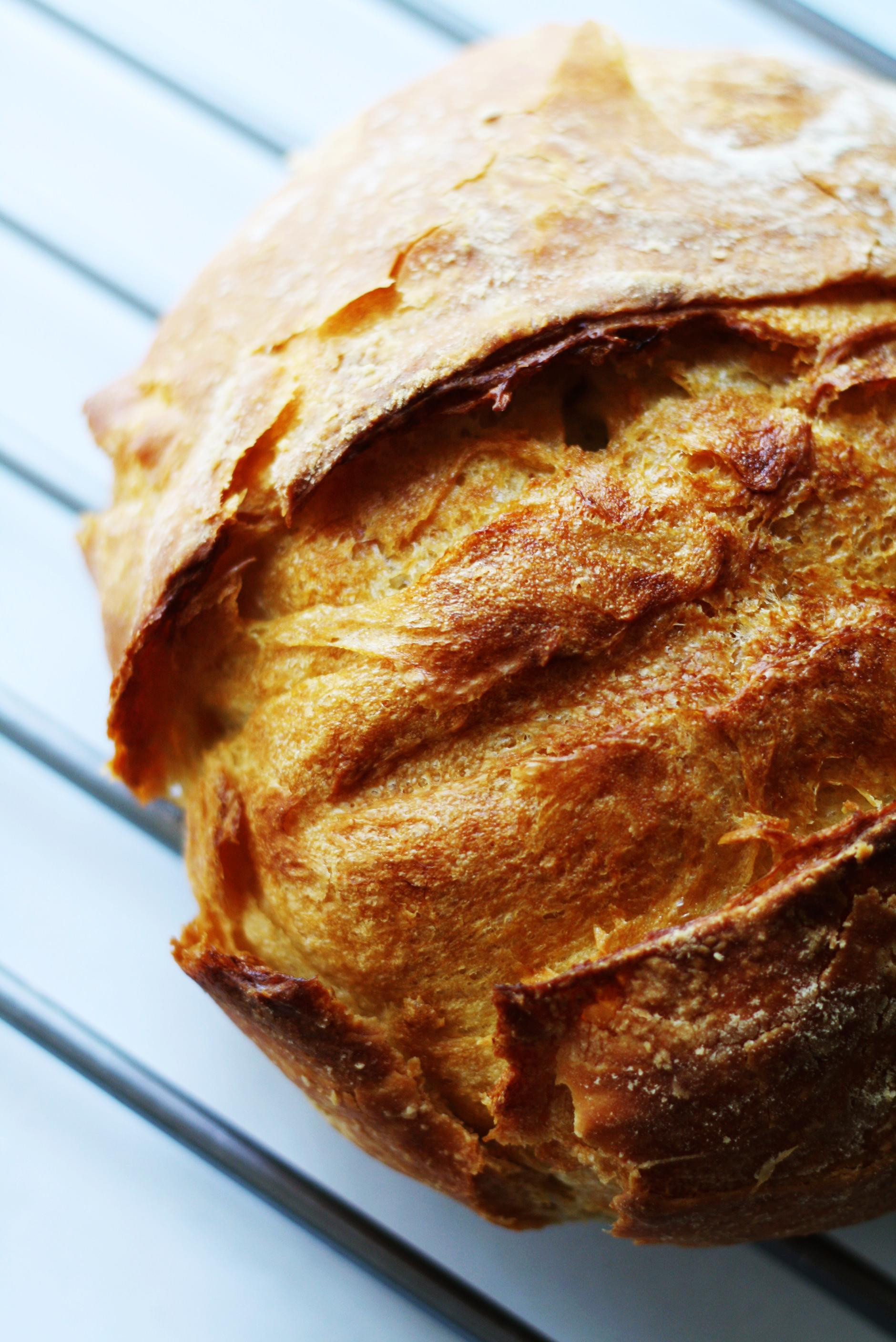 Od brašna, vode, soli i kvasca umijesite tijesto. Pustite da stoji 20-ak minuta prekriveno pa mu dodajte ribani hladni maslac. Sada uhvatite tijesto za krajeve, rastegnite ga prema gore i preklopite, tako da tijestom prekrijete sav ribani maslac. Ponovno prekrijte pa pričekajte još 20 minuta i dodajte drugu polovicu ribanog maslaca. Preklopite s četiri strane i oblikujte u čvrstu kuglu. Stavite na pobrašnjenu podlogu (najbolje papir za pečenje), a po potrebi možete pobrašniti i samu kuglu tijesta. Preklopite naopačke preokrenutom posudom u kojoj ste do sada držali kruh i pustite još 20-ak minuta da se diže. Za to vrijeme zagrijte pećnicu na 230 °C, a u nju stavite posudu s poklopcem. Nakon 20-ak minuta zagrijavanja, kruh prebacite u posudu za pečenje na papiru za pečenje, poklopite i pecite 15-20 minuta. Prije pečenja kruh možete i zarezati žiletom ili oštrim nožem, pa čak i škarama. Nakon pečenja s poklopcem, maknite ga i kruh nastavite peći na 200 °C dok ne poprimi lijepu, zlatnu boju. Prije rezanja ohladite (ne kao ja).