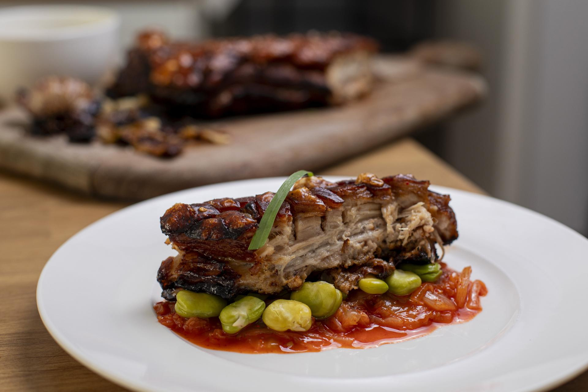 SPORO PEČENA SVINJSKA POTRBUŠINA S KIMCHIJEM I ZAČINJENIM BOBOM
