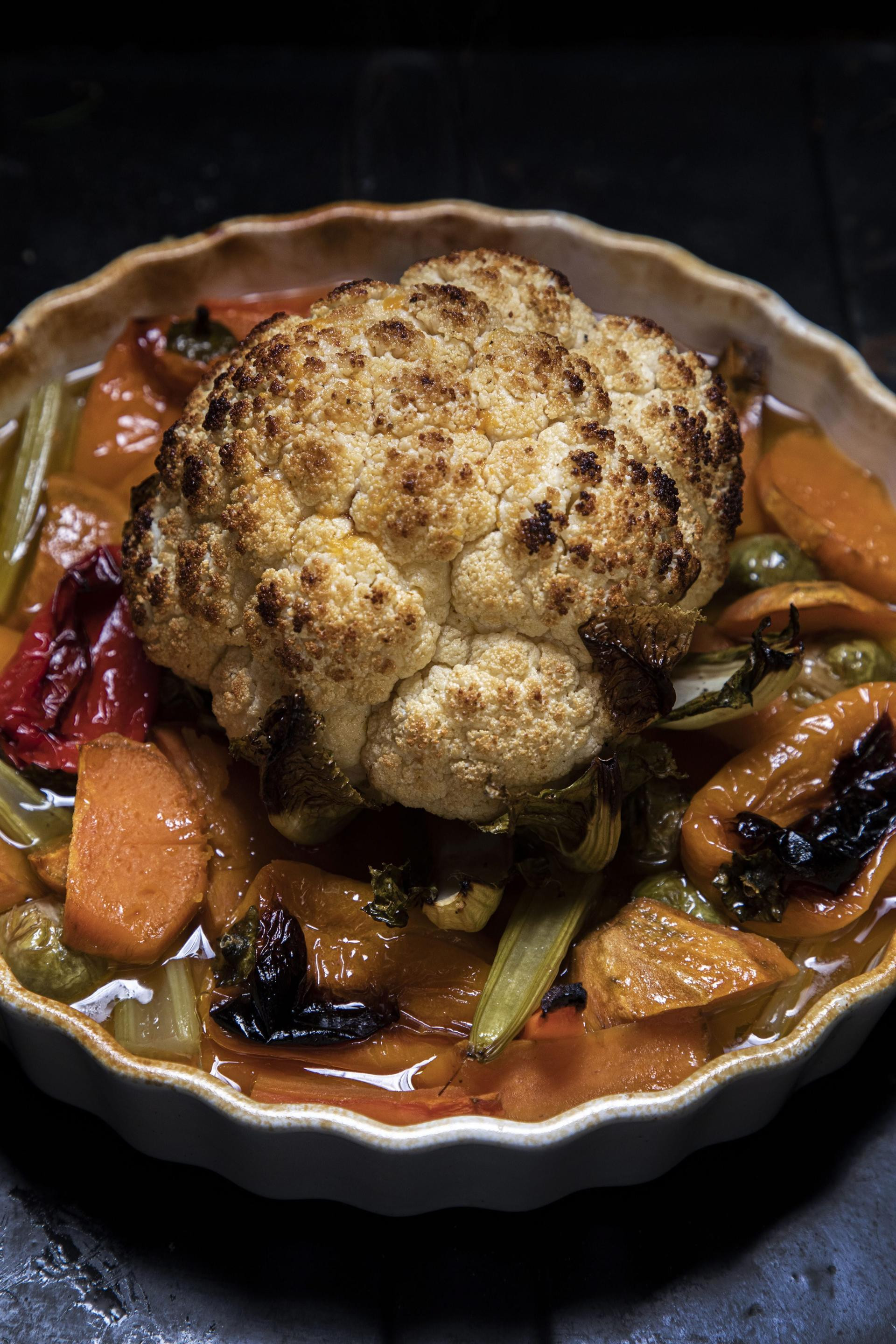 Nakon 45 minuta posudu izvadite, umakom od pečenja obilno zalijte cvjetaču i ostalo povrće pa vratite u pećnicu i pecite još oko 45 minuta. Povrće poslužite toplo, uz sezonsku salatu.