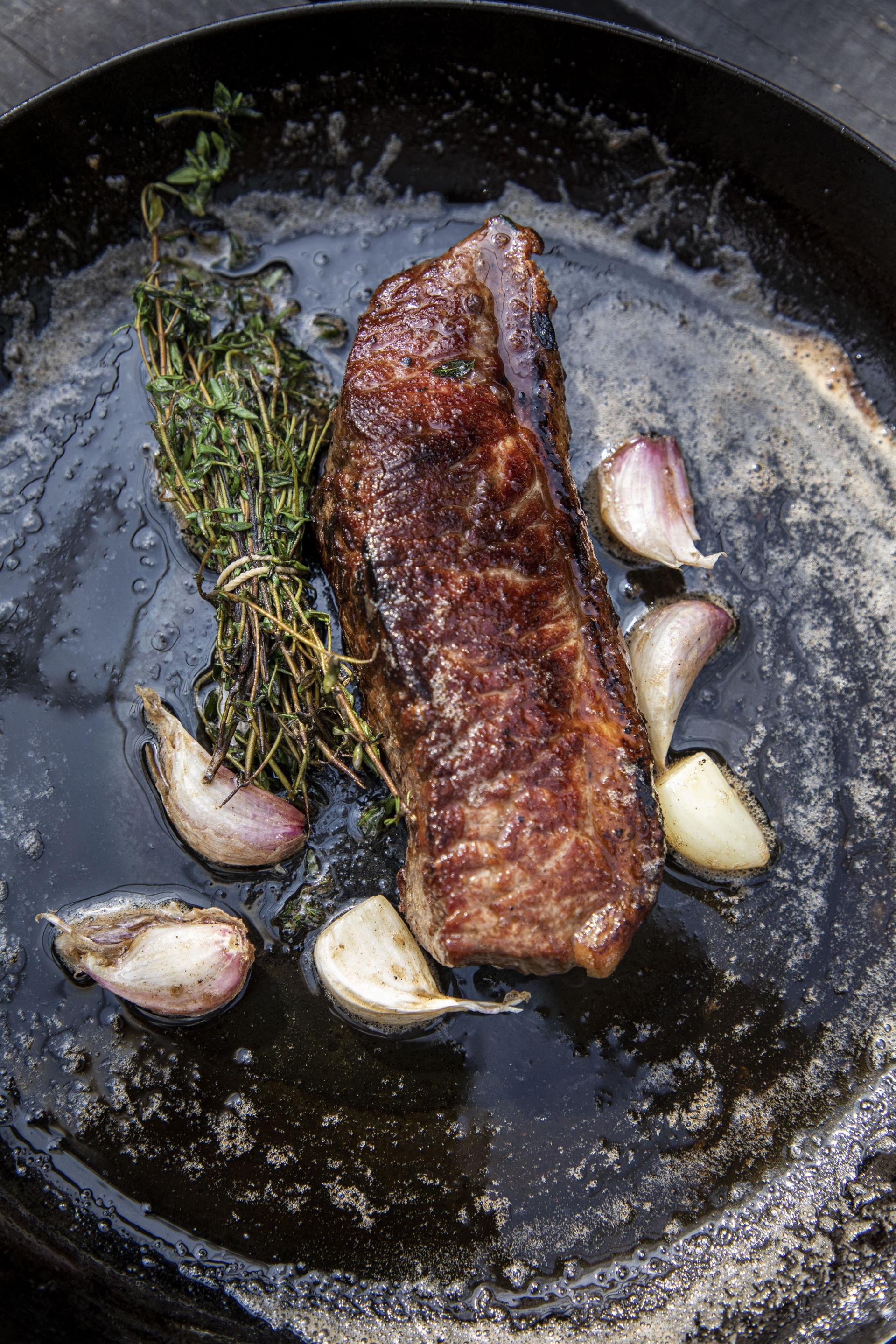 Dobro zagrijte željeznu tavu, zapecite meso s obje strane i dodajte pripremljeni aromatizirani maslac. Kad se sve dobro zagrije, žlicom prelijevajte steak vrućom otopinom i okrećite ga. Ovim postupkom (tzv. basting) meso će dobiti arome maslaca, koji možete slobodno pustiti i da malo zagori do okusne note lješnjaka. Najvažnije je da meso ostane medium rare, najviše medium pečeno, a fda dobije hrskavu koricu. Svemu dodajte francusku kupku - zapečene režnjeve češnjaka i svežanj majčine dušice, pa poslužite uz dobro crno vino.