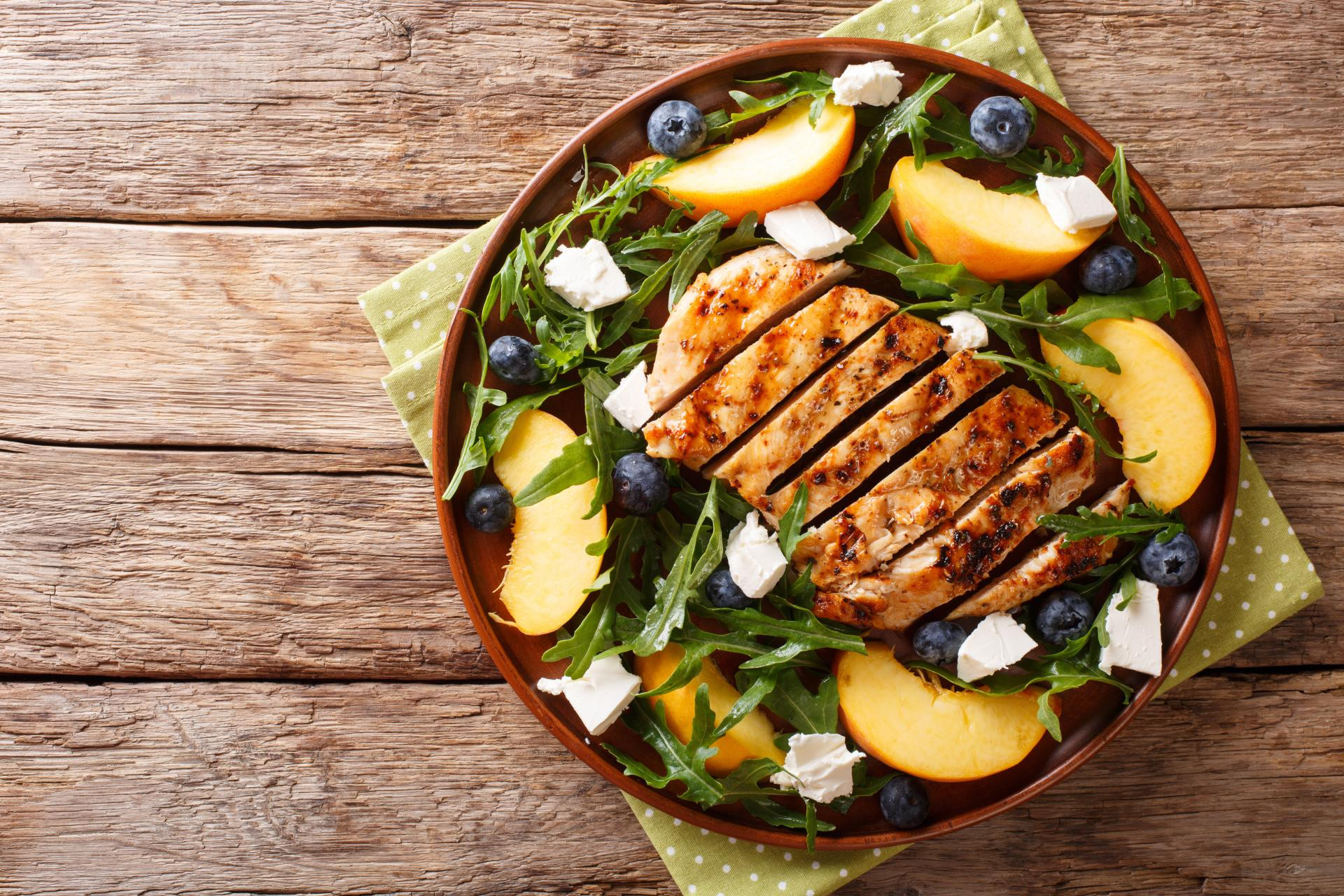 Grilana pileća prsa sa svježim breskvama, borovnicama, rikolom i feta sirom