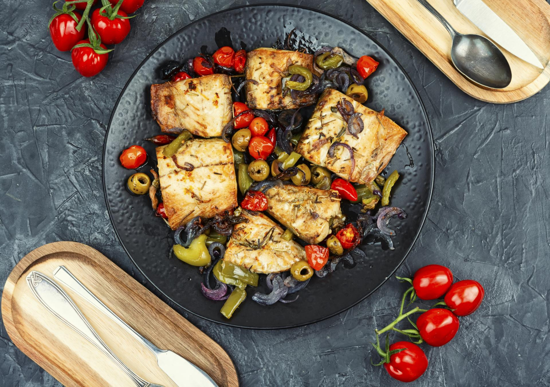 Pečena skuša s pirjanim rajčicama, paprikom i maslinama