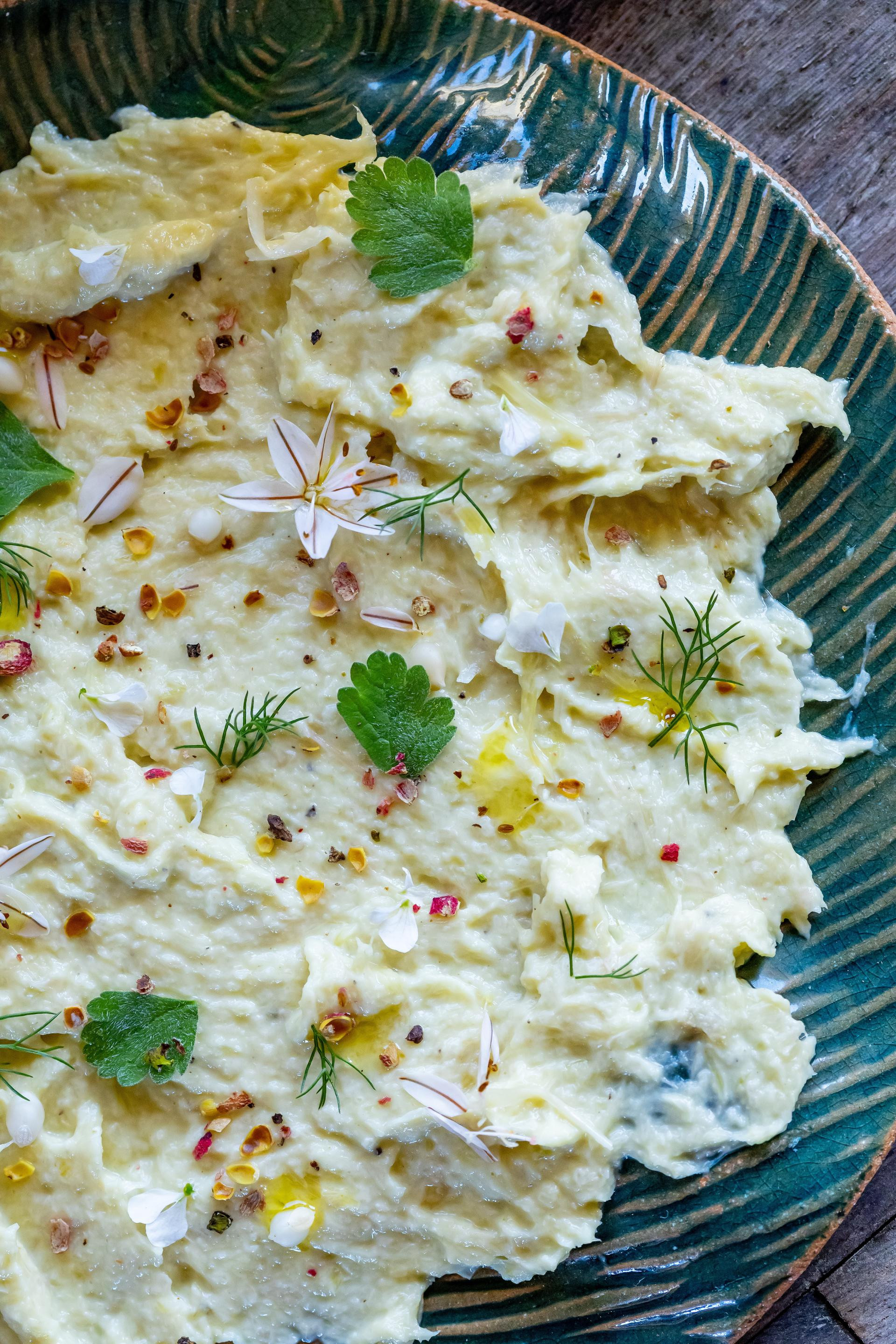 Prebacim u pećnicu i "kuham" na istoj temperaturi dok poriluk sasvim ne omekša kao maslac. Procijedim i izblendam s uljem iz confita i začinim cvijetom soli i koje zrno papra. Poslužujem uz pečeni kiseli kruh, uz brzo ukiseljene vrhove poriluka, sušene rajčice, cvjetove brdena, svježe listiće koromača i malo nasjeckanih oraha.