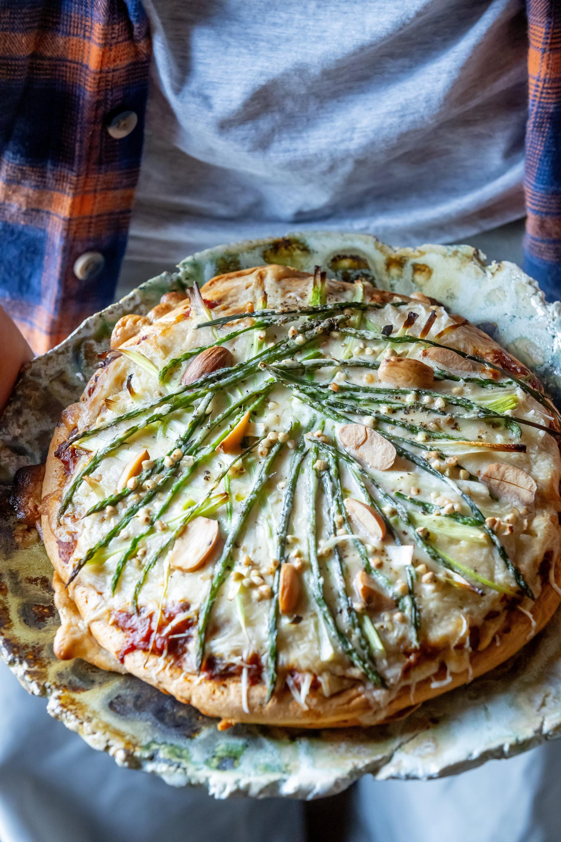 Na tijesto od leće slažem prvo šalšu, pa malo kremastog umaka, na to poslažem poriluk divlji i šparoge, opet zalijem kremastim umakom, pa još dodam žireve. Pečem dok mi krema nije lijepa.