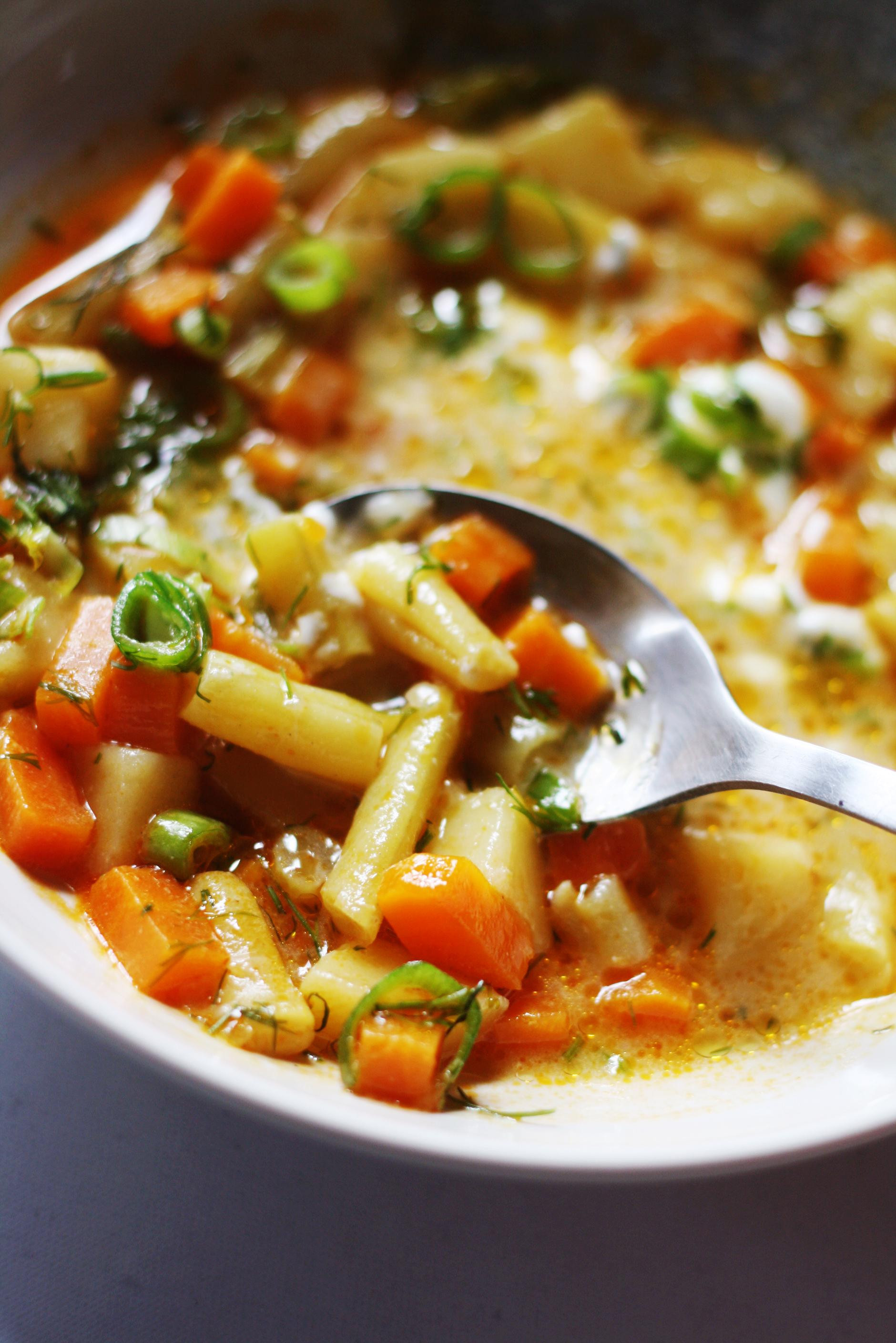 U dubljoj posudi zagrijte maslinovo ulje pa na njemu pirjajte sitno sjeckani luk. Dodajte na kockice nasjeckani krumpir i mrkvu. Pustite da poprime boju. Dodajte sol, papar, mljevenu papriku i druge začine koje koristite. Podlijte vodom ili povrtnim temeljcem i kuhajte 15-ak minuta, dok mrkva i krumpir ne omekšaju. Zadnjih pet minuta ubacite mahune koje ste prethodno nasjeckali. Kuhajte dok ne omekšaju. Na kraju odvojite oko 5 žlica tekućine iz variva i u posebnoj posudi ih pomiješajte s vrhnjem ili jogurtom. Dobro sjedinite, vratite u posudu pa kuhajte još minutu. Dodajte kopar, ako ga koristite i poslužite toplo uz žlicu vrhnja ili jogurta na vrhu. Po želji možete dodati i sitno sjeckani mladi luk.