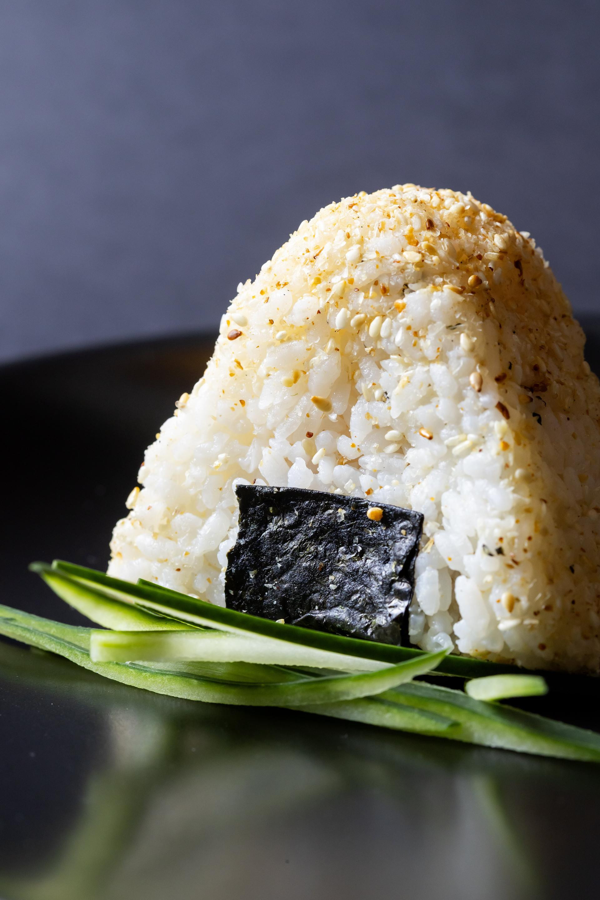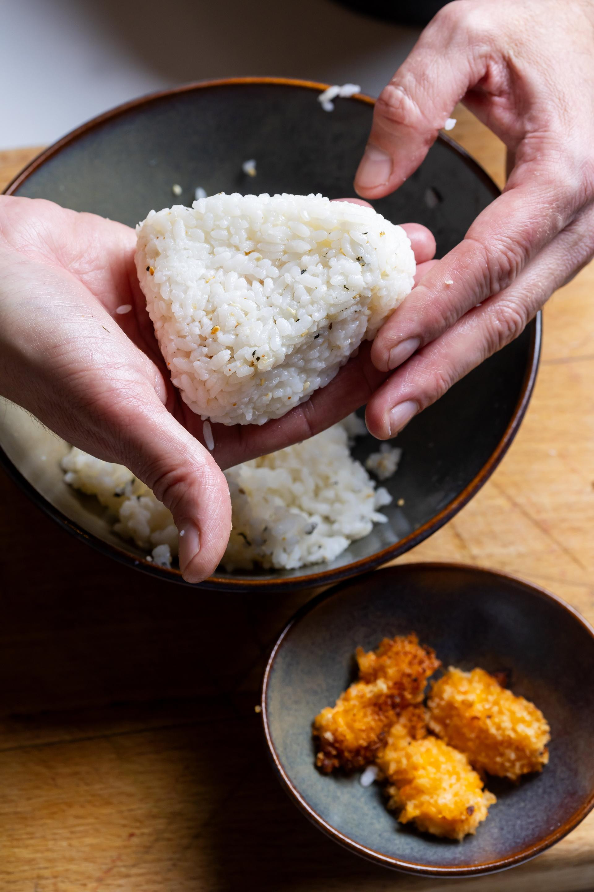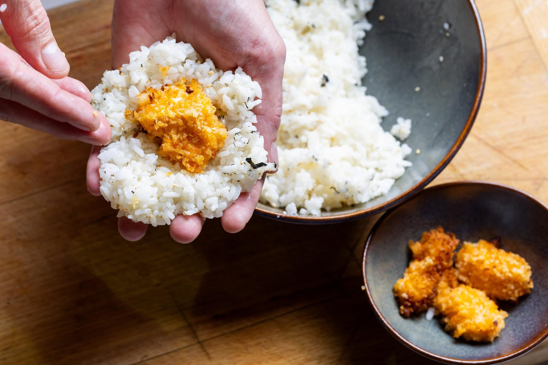 Kozice usitniti i začiniti po želji, oblikovati male polpete širine 3-4 cm i uvaljati ih u panko mrvice. Ostaviti tako na hladnom najmanje 30 minuta. Nakon što se smjesa dobro povezala, kratko pržiti u suncokretovu ulju. Dobro ocijediti na papirnatom ubrusu. Skuhati sushi rižu i začiniti furikake mješavinom (alga nori, tostirani sezam, shiso…). Oblikovati u ruci mali disk i na sredinu staviti punjenje po želji. Pažljivo zatvoriti u kuglicu, zatim oblikovati u formu trokuta debljine dva prsta. Na donji dio staviti list nori alge za lakše držanje onigirija prilikom konzumacije.