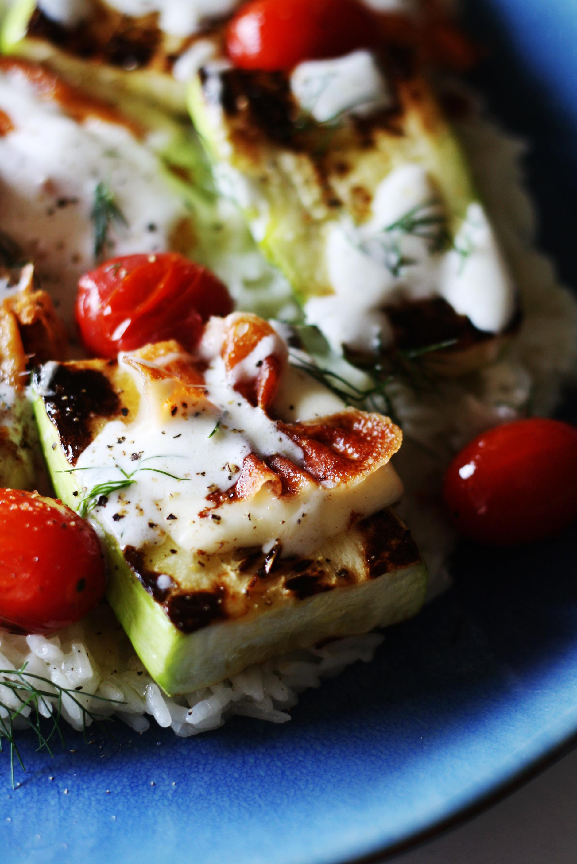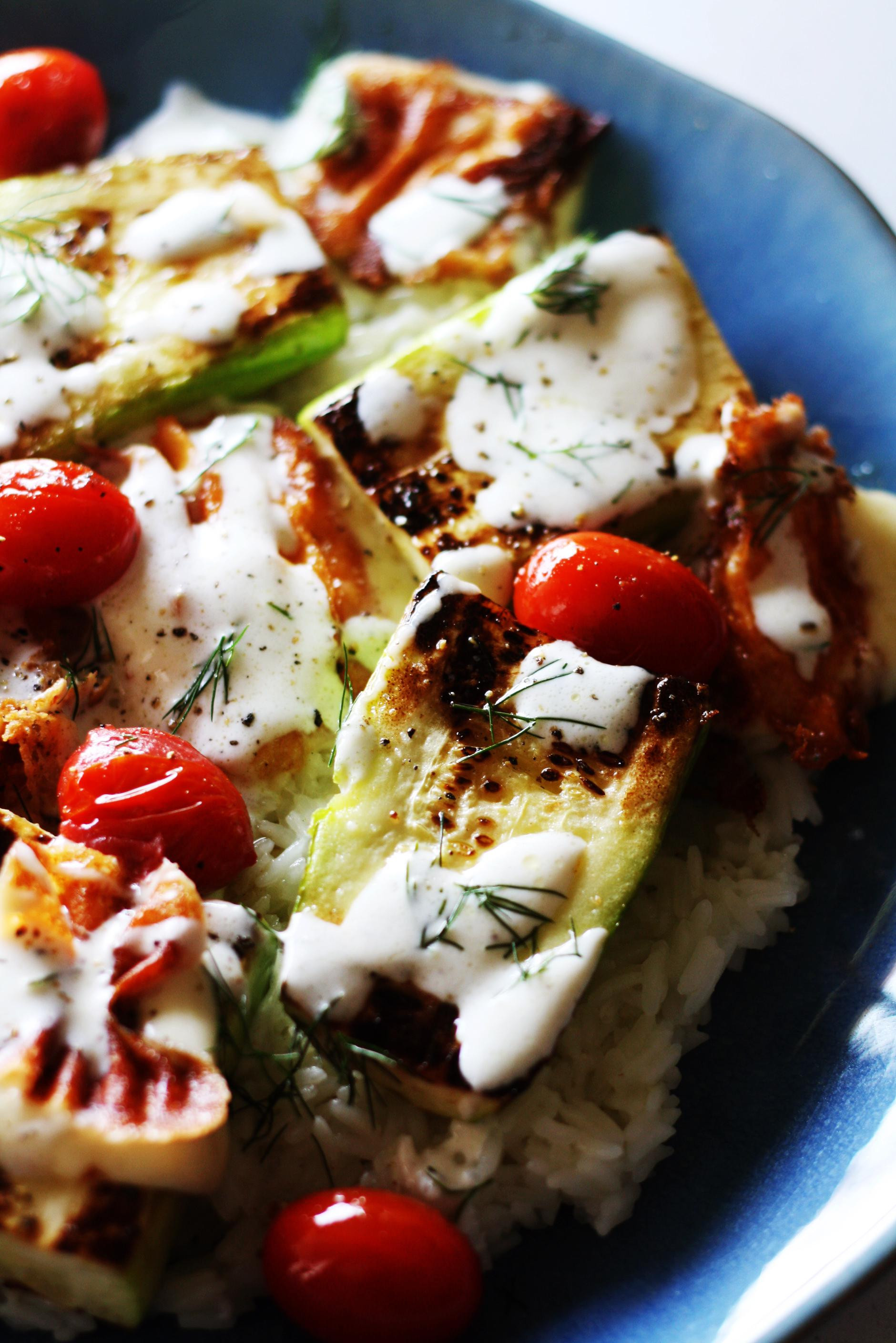 Tikvicu narežite na veće ploške, posolite je i pustite da otpusti tekućinu. Papirnatim ubrusima je obrišite i ispecite je na maslinovu ulju. Pustite da poprimi lijepu boju i zamiriše. Na jako zagrijanu tavu odmah stavite i na kockice narezan škripavac i pustite da se zapeče sa svih strana. Za to vrijeme skuhajte prilog koji će biti podloga, to može biti riža ili palenta, a može biti i tjestenina. Prilog stavite na dno, a po njemu rasporedite pečene tikvice i sir. U grčki jogurt dodajte sjeckani kopar, sok pola limuna, protisnuti režanj češnjaka, maslinovo ulje, sol i papar. Pokapajte dressing po salati i pospite s još malo kopra. Poslužite kao toplu ili hladnu salatu.
