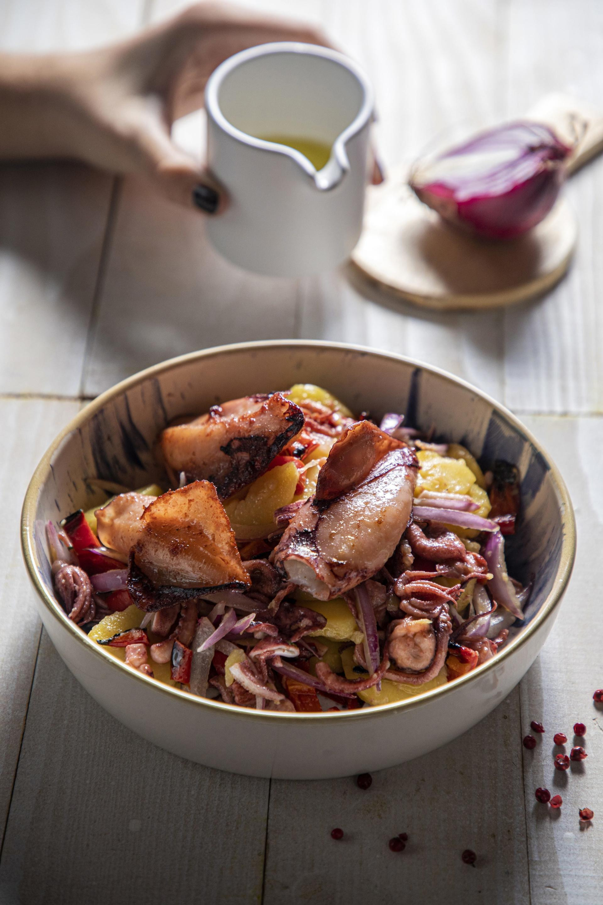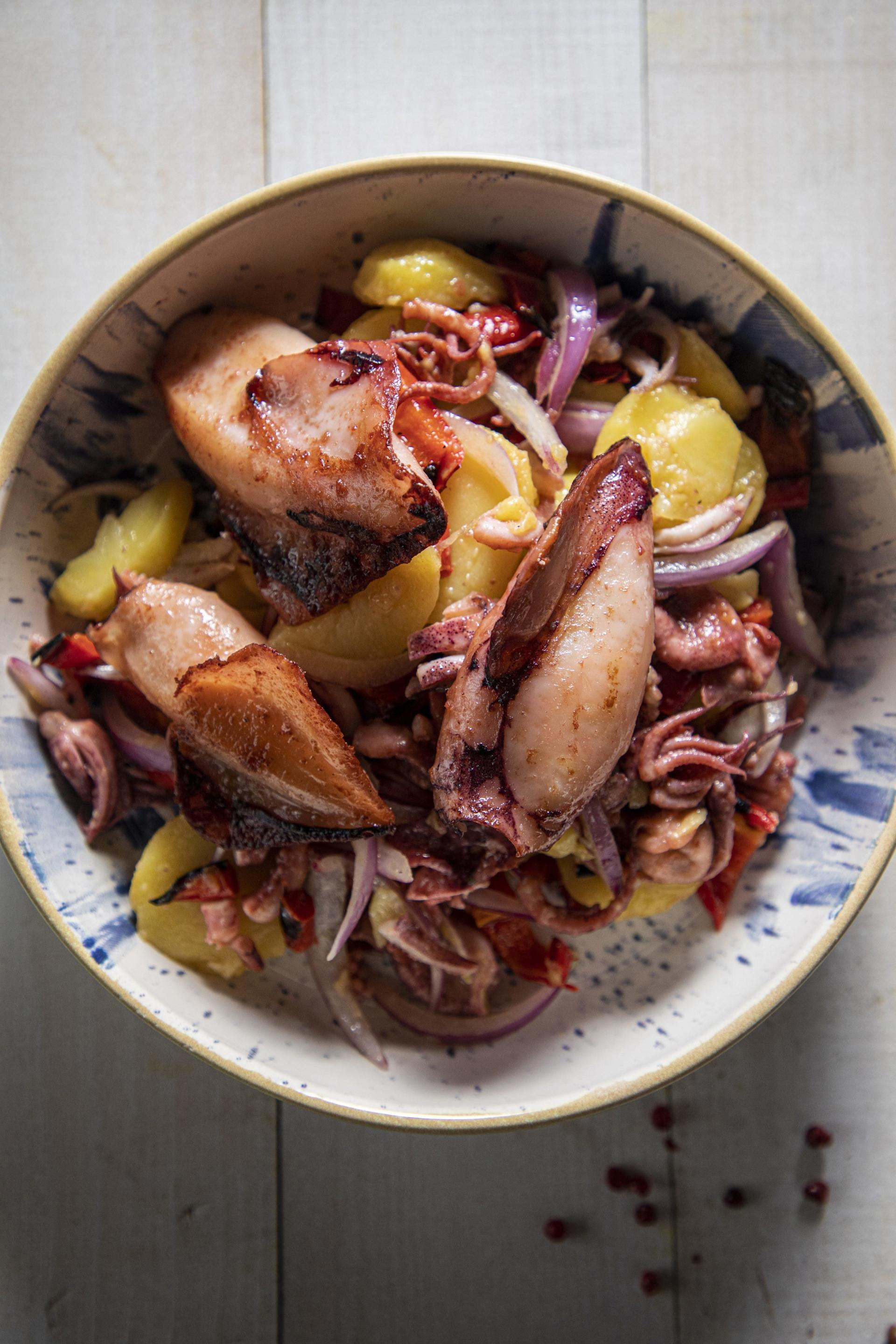 Početak jeseni idealno je doba za pripremu ove salate. Zašto? Pa zato što se u istoj zdjeli spajaju lignje, koje nas još uvijek malo podsjećaju na ne tako davno prošle ljetne dane, zasitan krumpir koji volimo u svako doba godine i pečenu papriku koja miriše na sve kraće jesenske dane. Iako se spoj na prvu može učiniti neobičnim, ova kombinacija funkcionira više nego dobro i otkad nam je naša suradnica Slavica Šagolj otkrila recept, baš mu se često vraćamo.