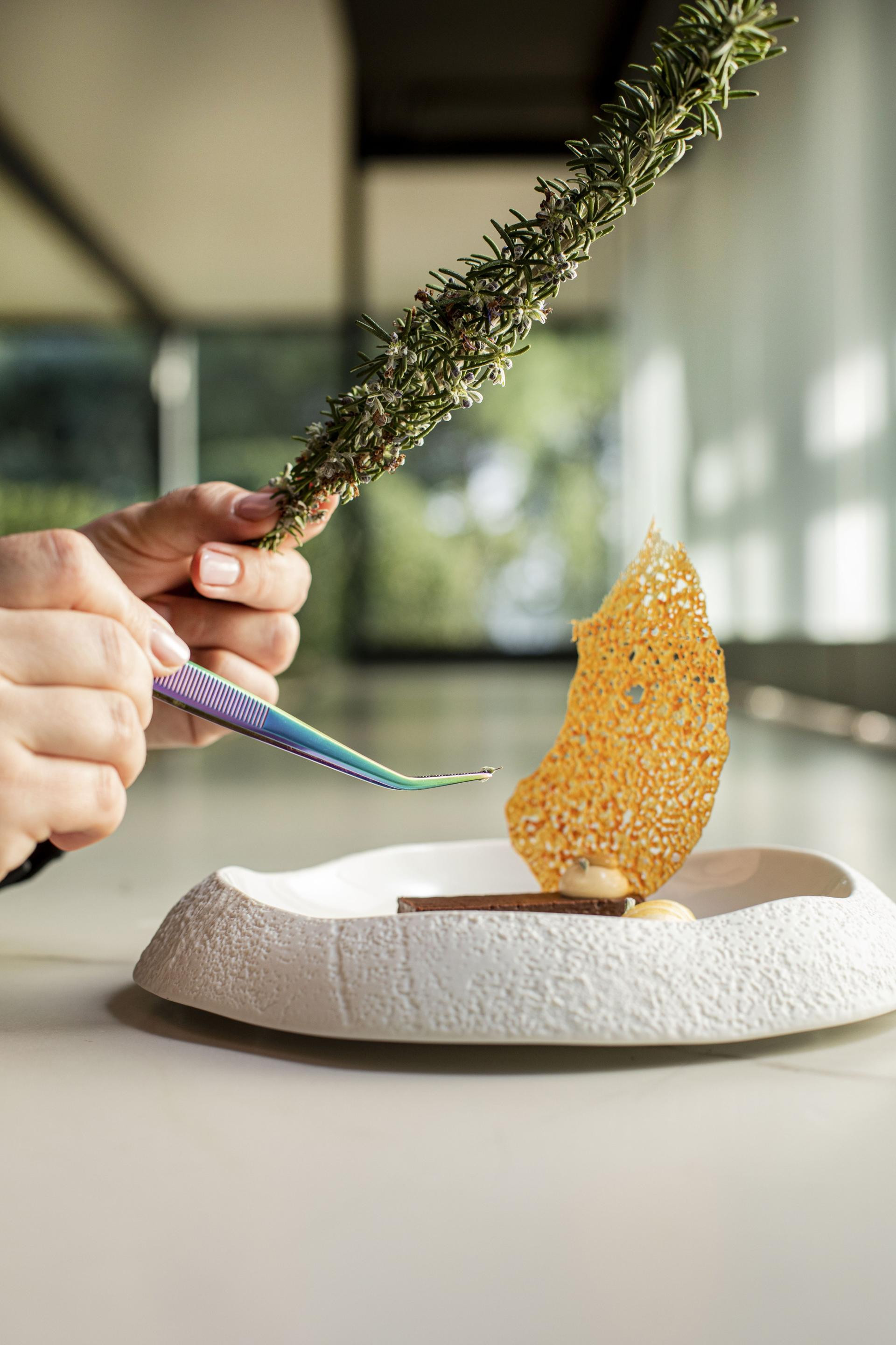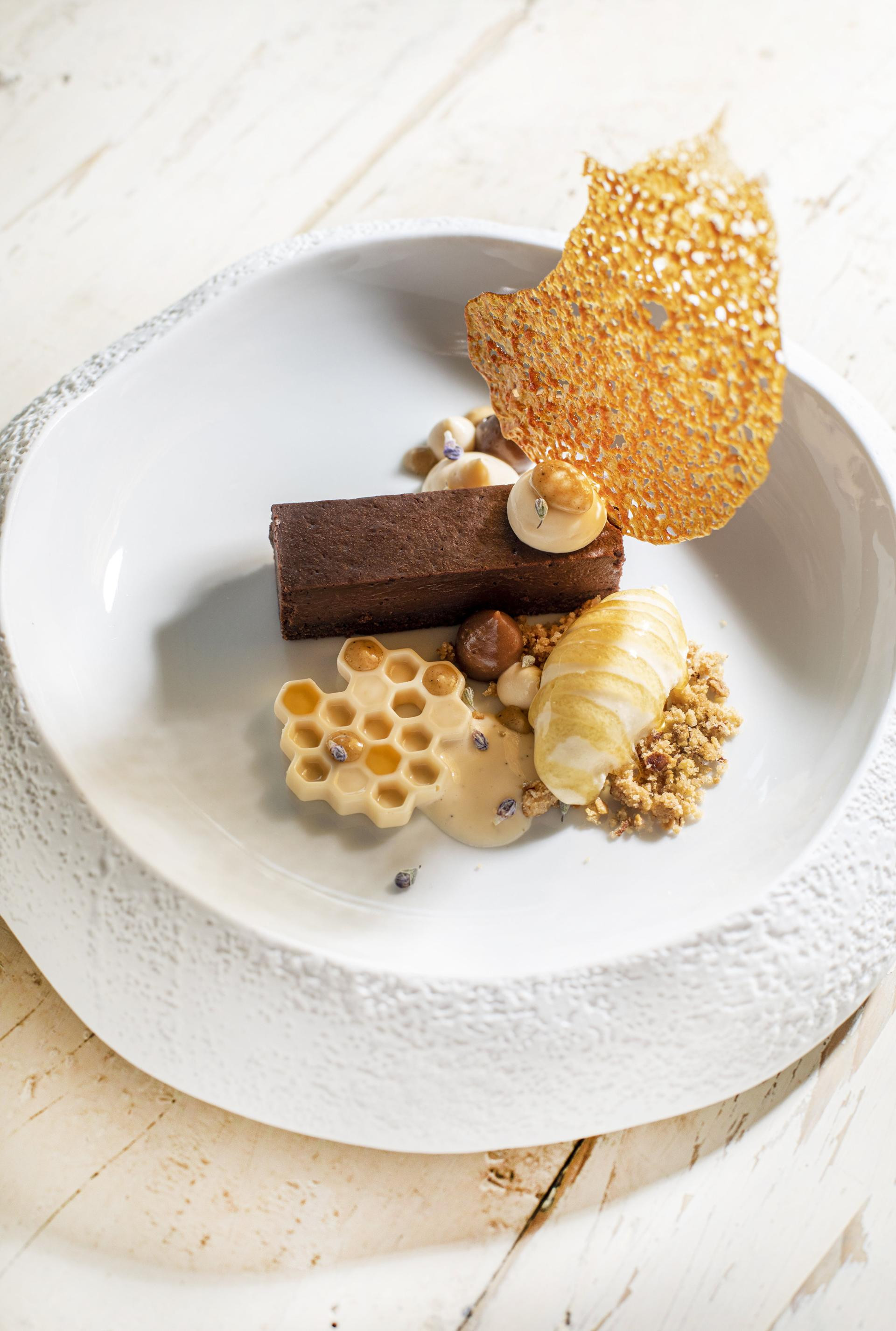 Serviranje: Pravokutno odrežite tart od čokolade, pored stavite saće od med crémeuxa, crumble od lješnjaka, quenelle od sladoleda od meda koji ćete dekorirati čistim medom od kadulje (ja sam koristila onaj s otoka Paga), dekorirajte tufnicama crémeuxa od meda, crémeuxa od meda i čokolade, pralina umakom od badema i tonke te cvjetićima ružmarina. Na sam tart stavite tufnu crémeuxa od meda i praline umak od badema i tonke, a na kraju na vrh stavite karamelu od naranče i pored malo crème anglaisea.