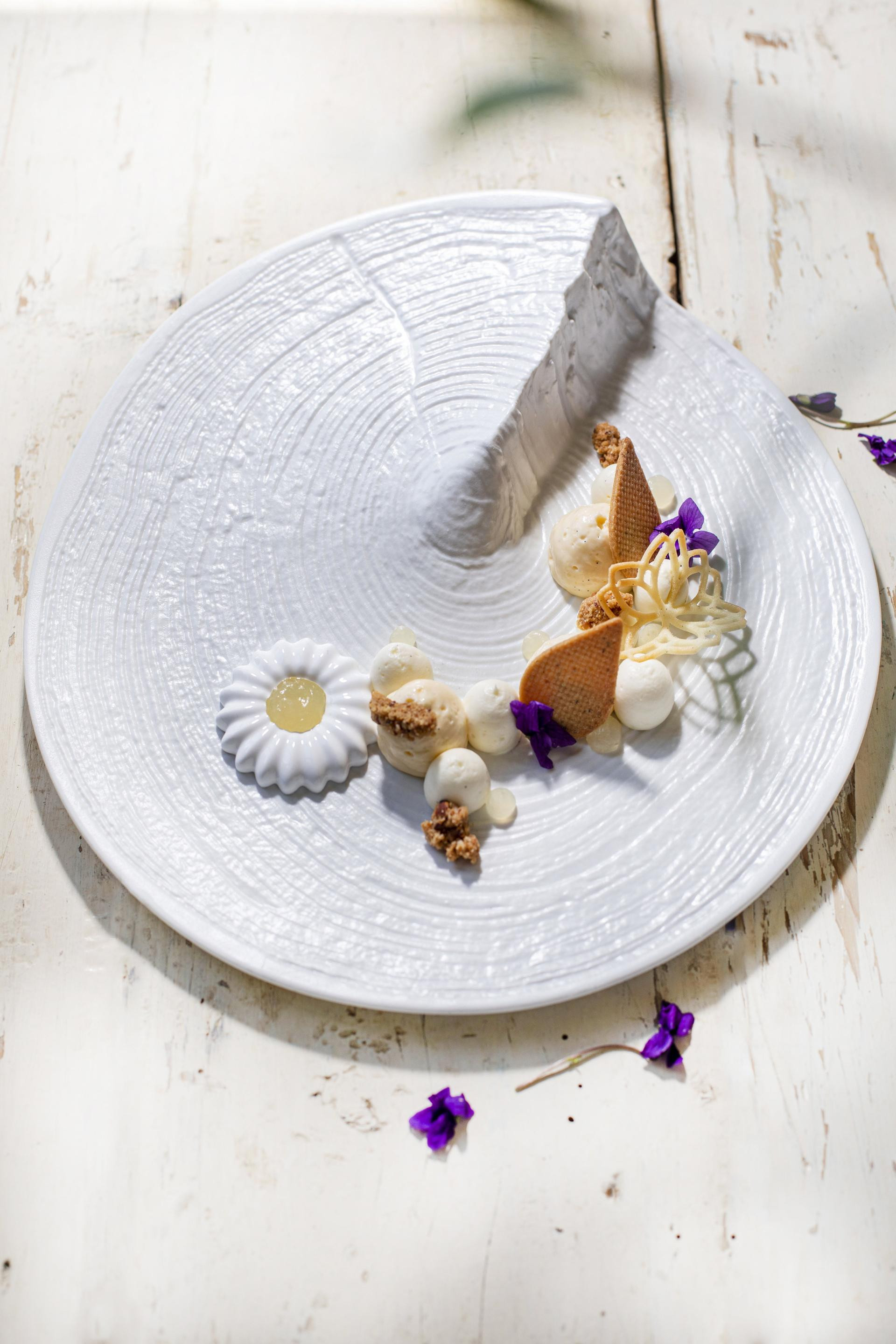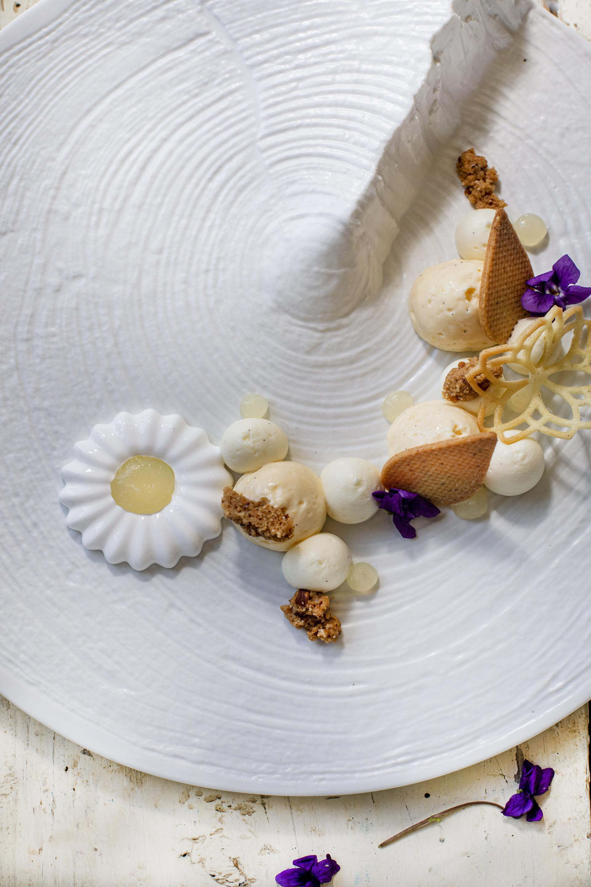 Serviranje: U obliku polumjeseca na tanjuru servirajte tufnice kreme od limuna, lupanog ganachea od bijele čokolade i gela od limuna. Dekorirajte keksom i crumbleom. Pored istisnuti cvjetić ili zvjezdicu od meringe i u sredinu, kao tučak, istisnuti gel od limuna. Dekorirati tuile cvijetom i svježim cvjetovima ljubičica.