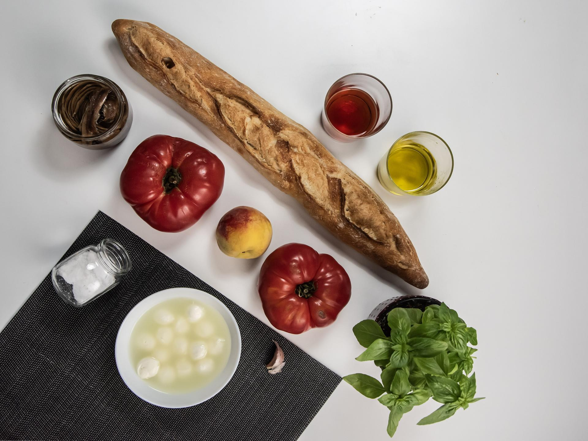 Stari kruh natrgajte i ubacite u zdjelu. Dodajte rajčicu narezanu na kocke, a zatim i breskvu. U zdjelici ili teglici pomiješajte vinski ocat, maslinovo ulje, sitno sjeckane inćune, ribani režanj češnjaka, bosiljak, malo soli. Sve dobro pomiješajte i prelijte po rajčici i kruhu. Na kraju dodajte mozzarellu i još bosiljka.