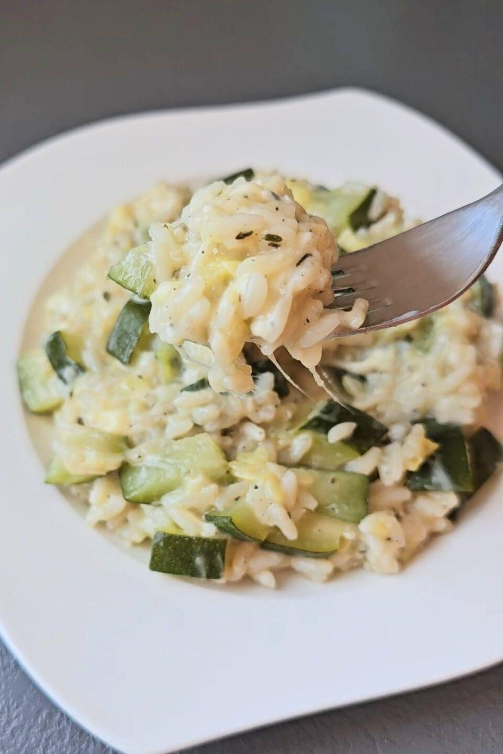 Kratko prepržite češnjak i tikvicu, dodajte rižu, prelijte vinom i postupno dolijevajte temeljac. Na kraju umiješajte sireve i poslužite vruće.