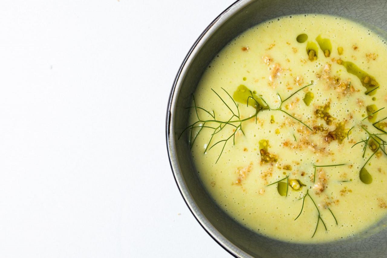 Na pola količine maslinova ulja propirjajte ljutiku, dodajte paski rezane na trakice od 2 cm, sitnije narezan krumpir te kratko propirjajte sve zajedno, začinite solju i paprom pa podlijte povrtnim temeljcem. Smanjite temperaturu i kuhajte dvadesetak minuta. Tako pripremljene namirnice izraditi u blenderu zajedno s grčkim jogurtom i ostatkom maslinova ulja. Poslužite s koprom, a za naprednije ljubitelje kuhanja preporučujemo crumble od lješnjaka ili domaće krotone.