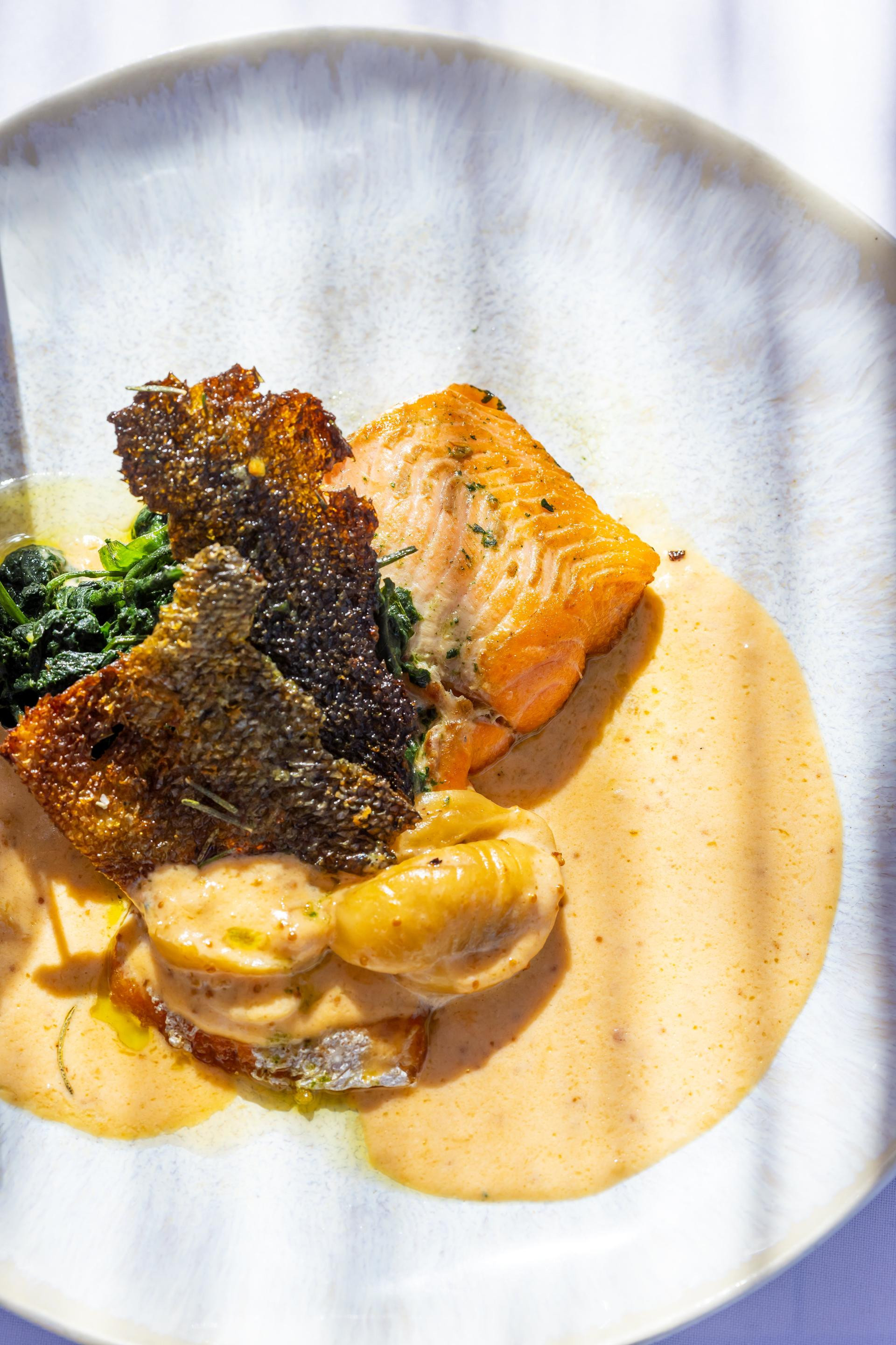 Pažljivo odabrani fileti losos pastrve peku se na tavi do savršene srednje pečenosti, zadržavajući sočnost i nježnu teksturu. Uz njih se poslužuje bogat umak pripremljen od suhih smokava, ribljeg temeljca, bijelog vina, korijandera, maslinovog ulja i češnjaka. Nakon što se umak reducira i procijedi, obogaćuje se vrhnjem za kuhanje, stvarajući skladan spoj slatkoće, začinske svježine i kremoznosti. Jelo se zaokružuje sezonskim prilogom od dinstane koprive i mlade kapule, čime se naglašava prirodni karakter i lokalni izričaj ovog tanjura.