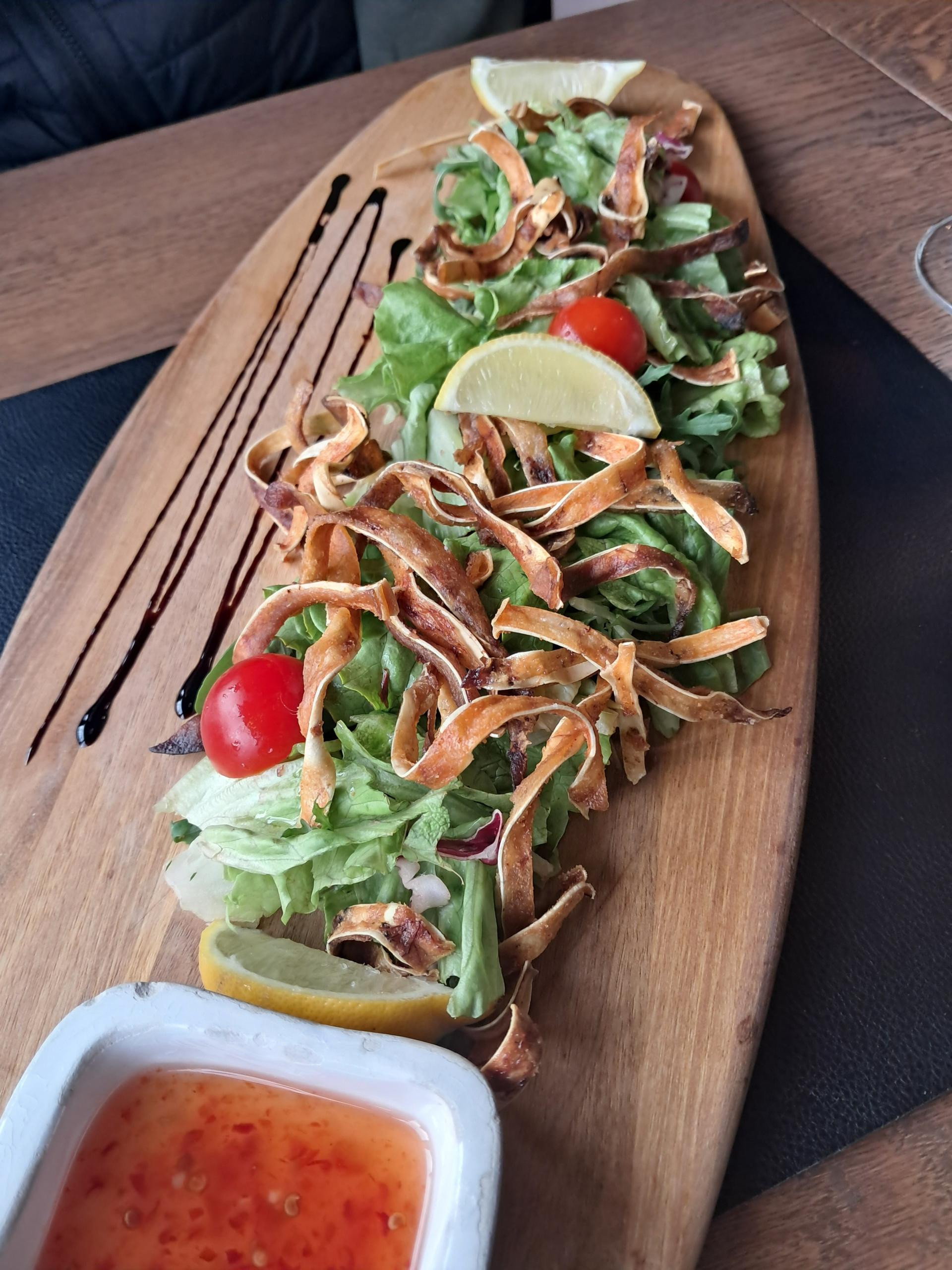 Hrskave svinjske uši došle su drvenom pladnju, položene na svježu miješanu salatu. Narezane na trakice, bile su nažalost papirnato tanke, sasvim dehidrirane, lišene one neodoljive pufaste hrskavosti i arome koju im daje masnoća. Svejedno, i ovakve kakve su bile, više nalik grickalici iz supermarketa, pojeli smo uz slatki chili umak do zadnje.