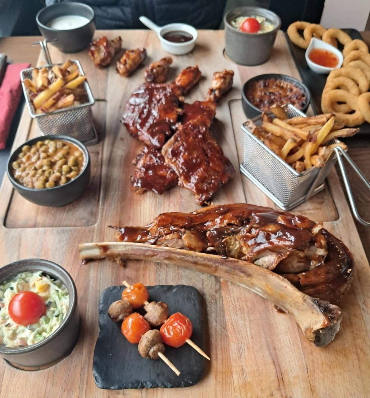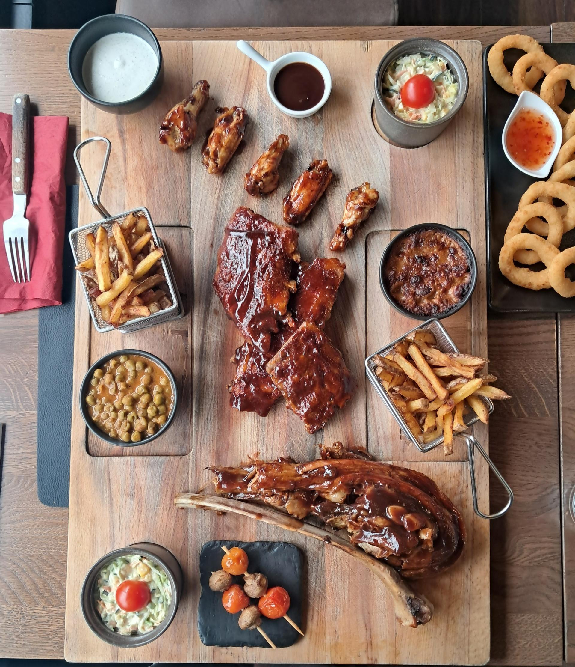 Dvadesetak minuta kasnije, na stol nam je došao veliki četvrtasti drveni pladanj - R&B Best of BBQ: pileća krilca, svinjska rebarca i jedno poveće teleće rebro s BBQ umakom, ranch umakom, sweet chilijem, coleslaw salatom, prženim kolutićima luka, ražnjićima od povrća, prženim krumpirom, zapečenim grahom i graškom u saftu.