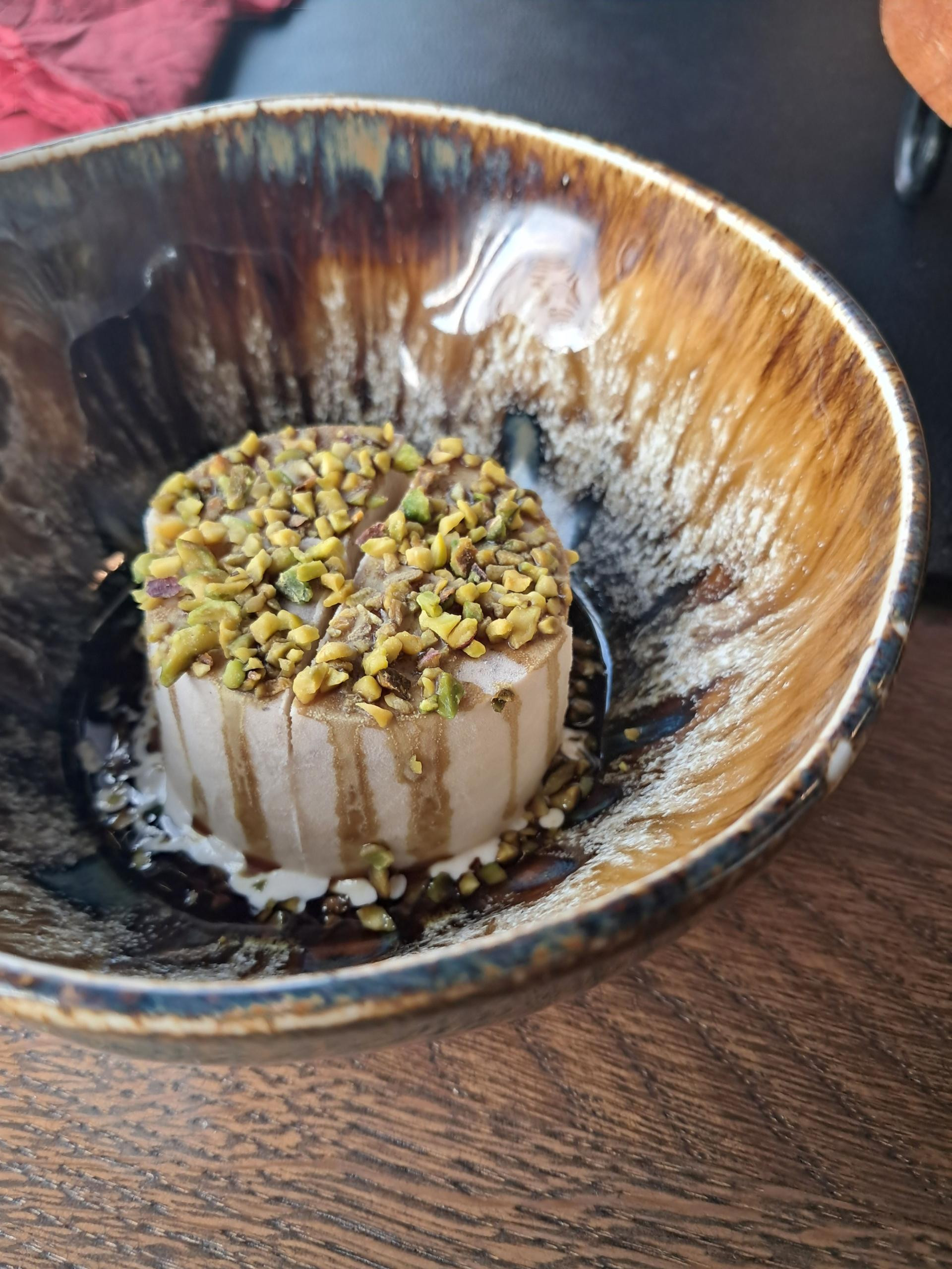 Naposljetku, desert: od tri koja imaju, odlučili smo se za domaći sladoled od vanilije s bučinim uljem i pistacijom (4,50 €) i crumble od jabuke (5,90 €), ali bez sladoleda uz koji ga inače serviraju.