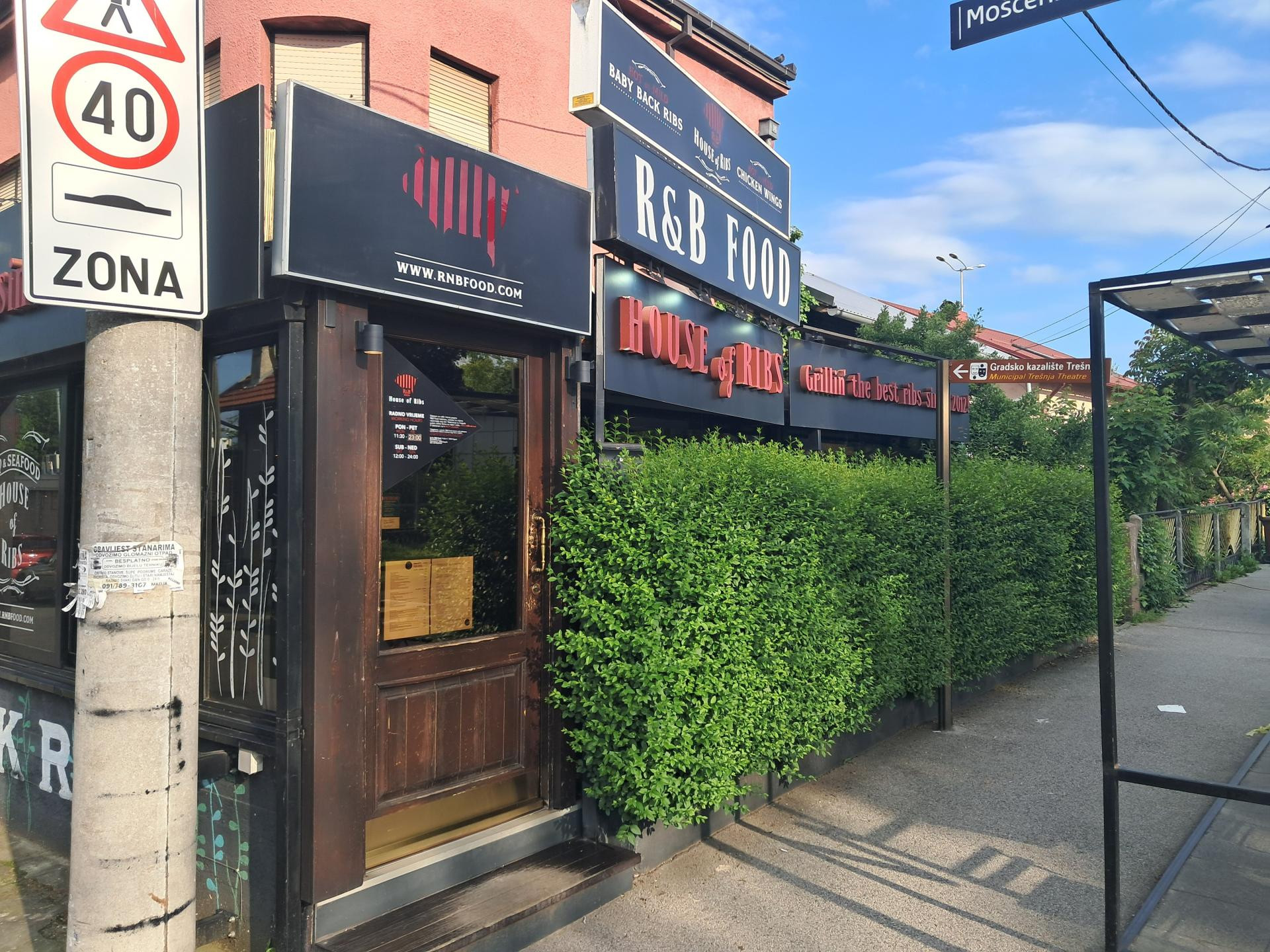 U R&B ušli smo u ponedjeljak oko pola četiri, kad nitko pri zdravoj pameti ne ide u restoran, pa smo, naravno, nas dvojica bili jedini gosti. Vrijeme ručka je prošlo, a večernja publika - koja redovito napuni ovih sedam ili osam stolova (plus još četiri stola u podrumskoj prostoriji) - još se nije počela okupljati. Prostor je vrlo ugodan, djelomično ostakljen, zidovi su veselo ukrašeni raznim štosnim izlošcima i memorabilijama, a sve skupa ipak ne djeluje jeftino i kič nego kao baš pouzdan, uhodan kvartovski lokal u koji su svi dobrodošli. Smjestili smo se za stol uz staklenu stijenu, s pogledom na susjedni ugostiteljski objekt koji ponedjeljkom ne radi. Muzika, kao da smo je sami birali - neopterećujuća soul, blues, rock klasika idealne glasnoće, ništa agresivno.