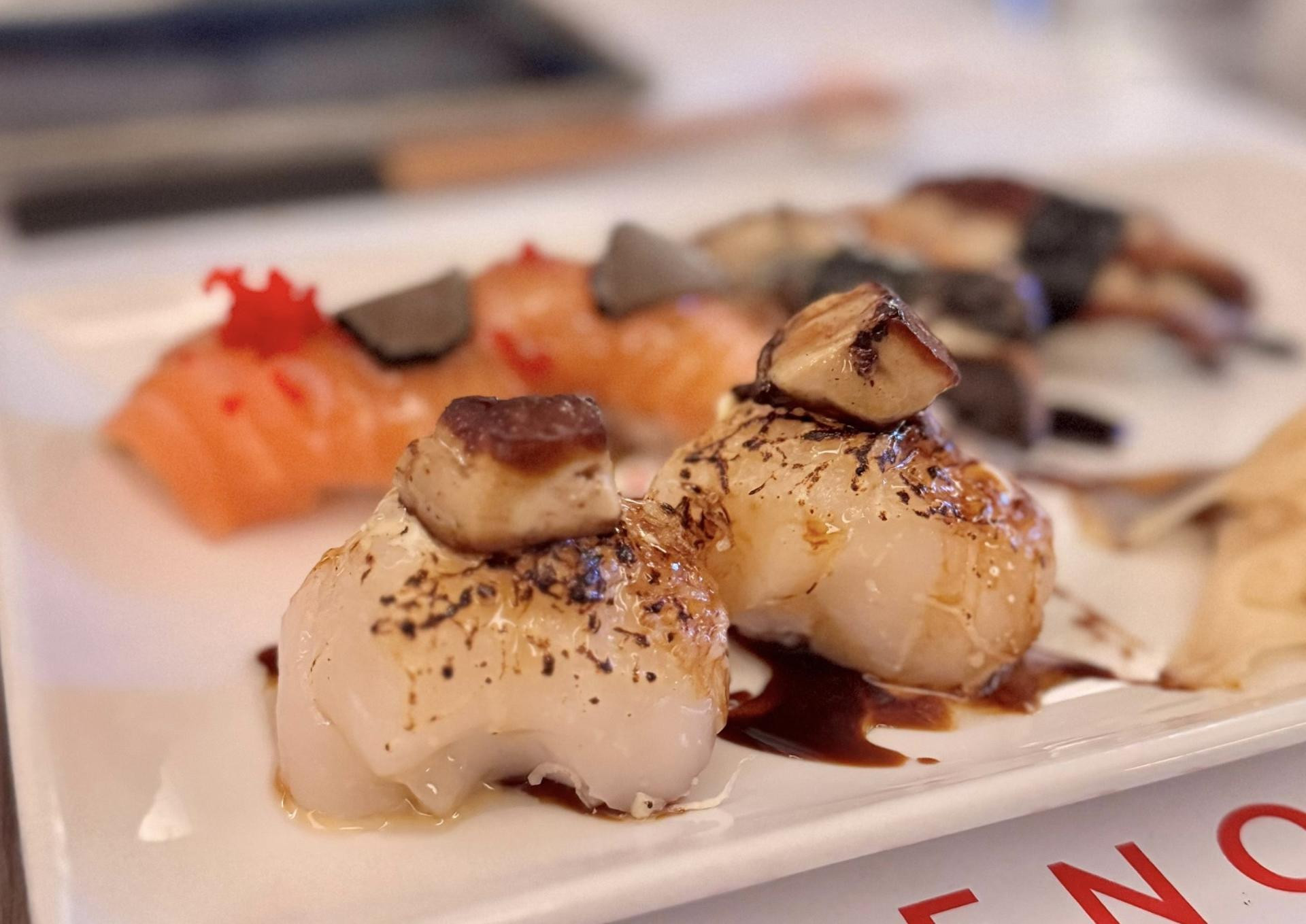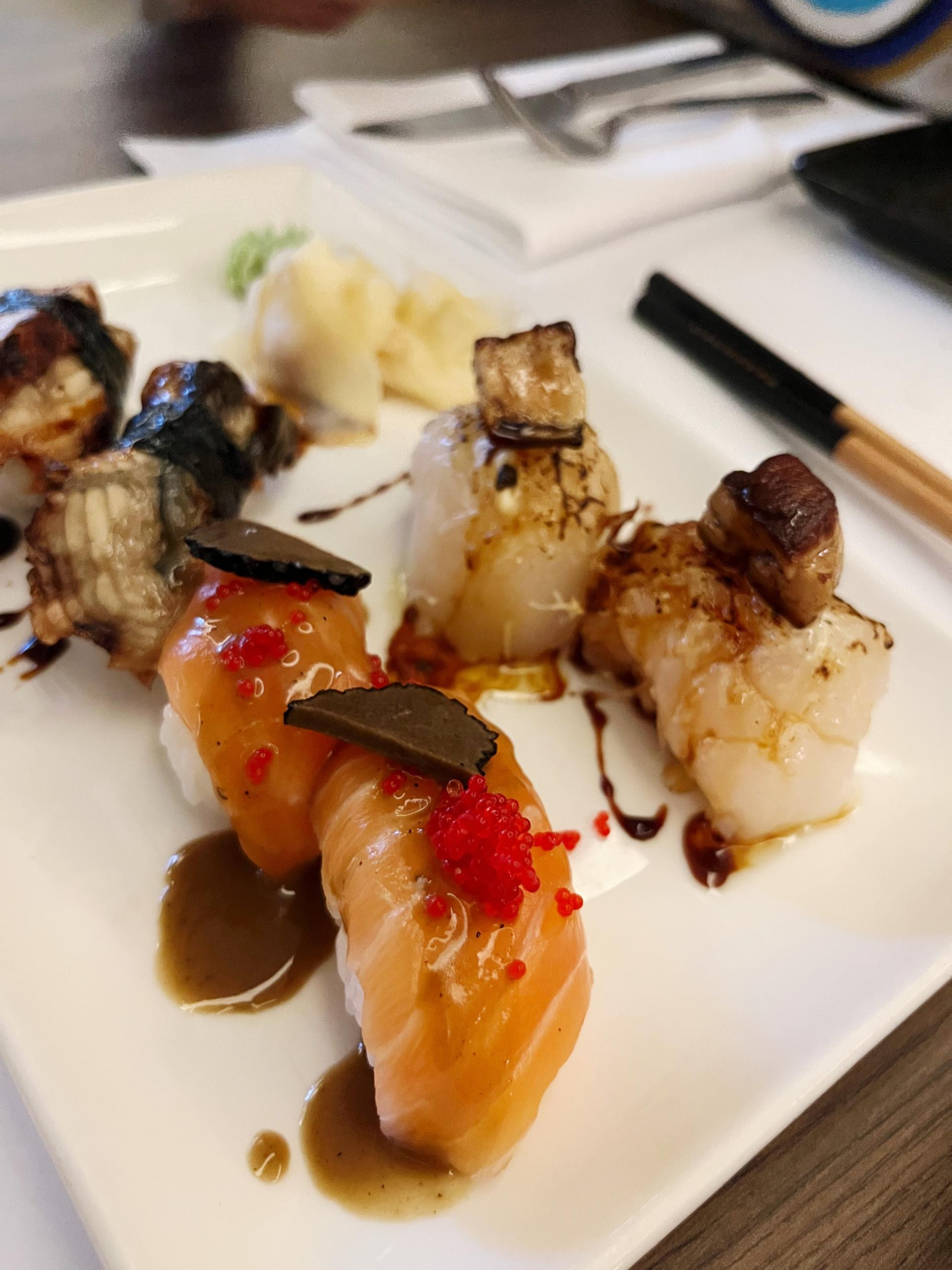 Nakon predjela, izrazili smo želju za sushijem i naš prvi izbor bila je selekcija chefa u kojoj se dobije sedam rolica, na što nam je osoblje ipak preporučilo da nam se pripremi mala selekcija nigirija za dvoje. I ovdje smo se prepustili njihovom odabiru i na stol nam je uskoro stiglo šest rolica. Dvije s jeguljom, koja je bila fino, hrskavo ispečena i slasna, zatim dvije s lososom i tartufom i dvije s jakobovom kapicom, medom i gusjom jetrom. Druge dvije rolice bile su dobre, zanimljive same po sebi, ali nisu bile ono što bismo naručili kada nam se jede sushi. Bili bismo daleko sretniji da su nam poslužili nekoliko komada rolica sa svježom tunom i lososom bez previše dodataka i kompliciranja, što nam, na kraju krajeva, najprije i padne napamet kada se zaželimo sushija.