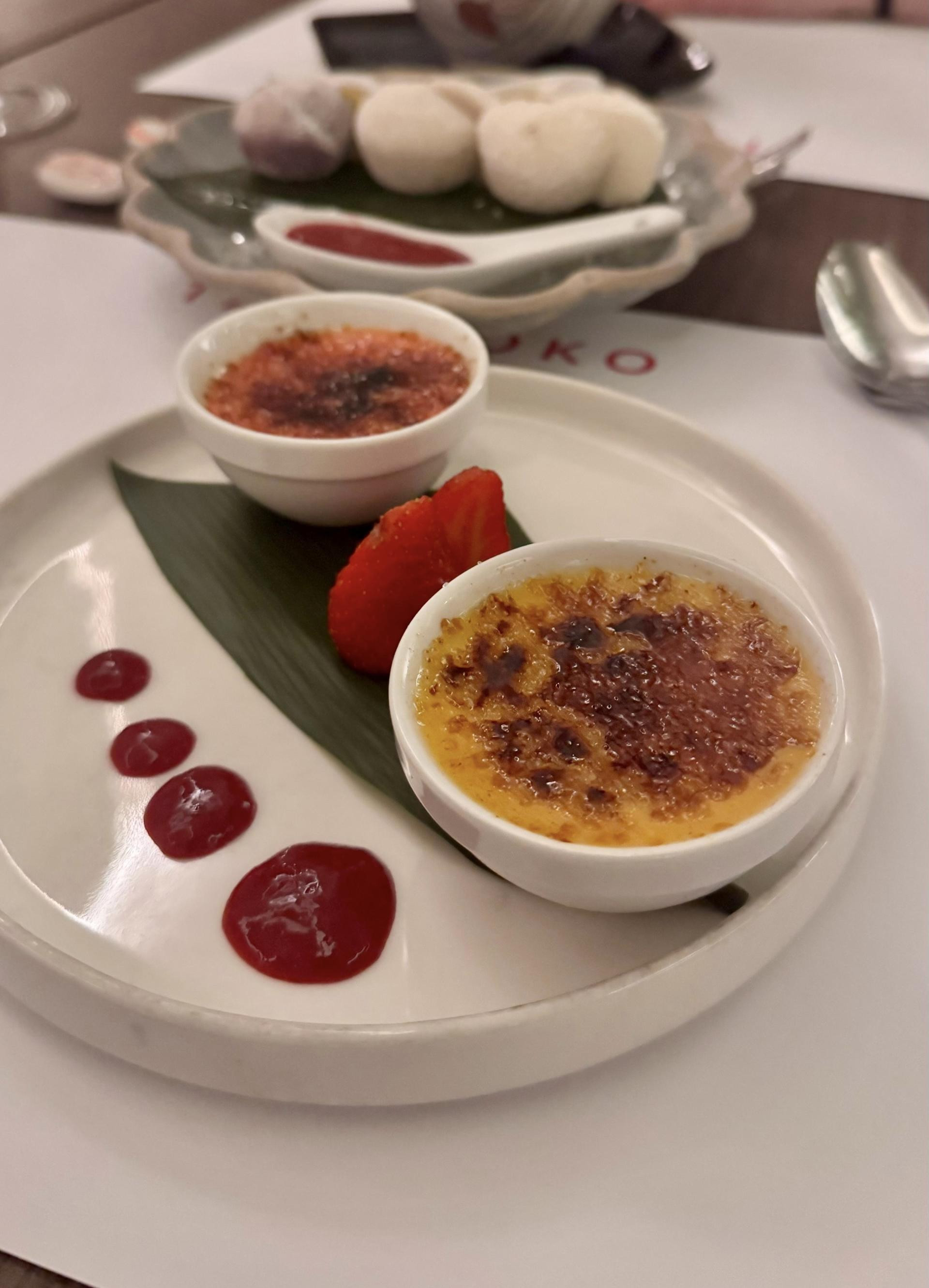 Na kraju, za desert smo odabrali goma no pafe (6,40 €), crême brulée (7,50 €) i mochi (8 €). Prvi desert bio je pjenica od sezama sa sladoledom od zelenog čaja i bio je prilično blag okusom. Sezam i zeleni čaj osjetili su se tek negdje u pozadini, a šlag i preljev od čokolade, koji su uz sve posluženi, bili su nam potpuno nepotrebni. Crême brulée je bio korektan, ali varijanta s jagodom nas je više podsjetila na puding nego na nježnu, svilenkastu kremu. Mochi sladoled nam se svidio najviše, i to onaj od marakuje, koji nam je u ustima eksplodirao kao mala okusna bombica. Odličan je bio i onaj od kokosa, ali i klasičan od vanilije.