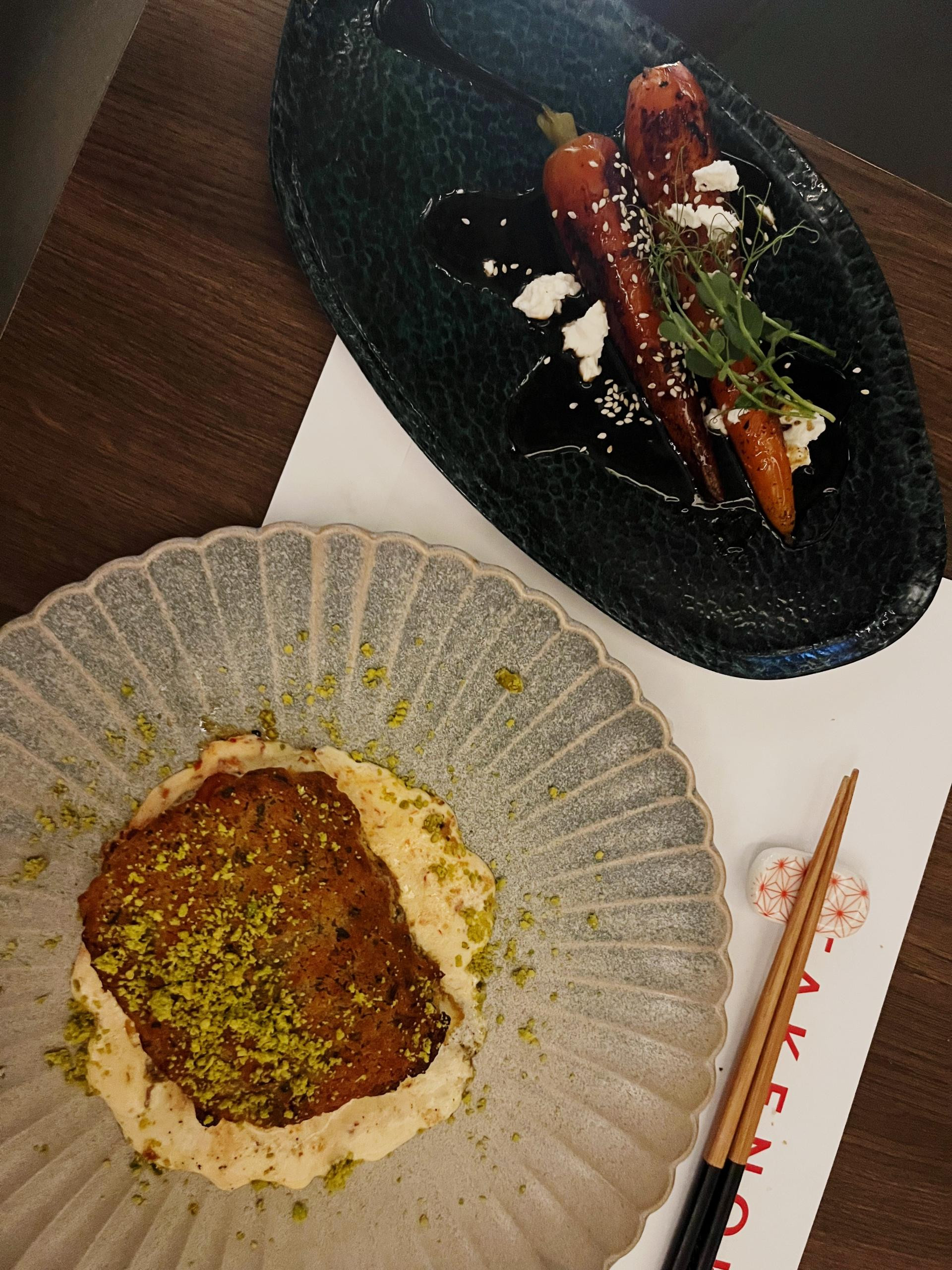 Za glavna jela dvoumili smo se između woka i nekog od konkretnijih jela, no uz kratko savjetovanje s osobljem, izbor je ipak pao na janjetinu i brancina. Točnije, janjeće kotlete s kruškom (38 €) i brancina s pistacijom (32 €). Za prilog, koji se naručuje zasebno, odabrali smo glaziranu mrkvu s kozjim sirom (8 €) i magic mushrooms s medom i sezamom (8 €). Kotleti su bili odlično začinjeni, sočni, mekani, kruška je bila dobro obrađena i ostala je blago hrskava, a pečeni mladi luk lijepo je zaokružio i osvježio tanjur. Brancin je bio dobro obrađen, ali beurre blanc, koji je nas više podsjetio na kakav bešamel umak, bio je težak i pomalo je pokrio ribu. Nakon predjela i sushija koji, kada se pogledaju porcije, i nisu bili preveliki, ovo jelo ipak nismo mogli završiti.