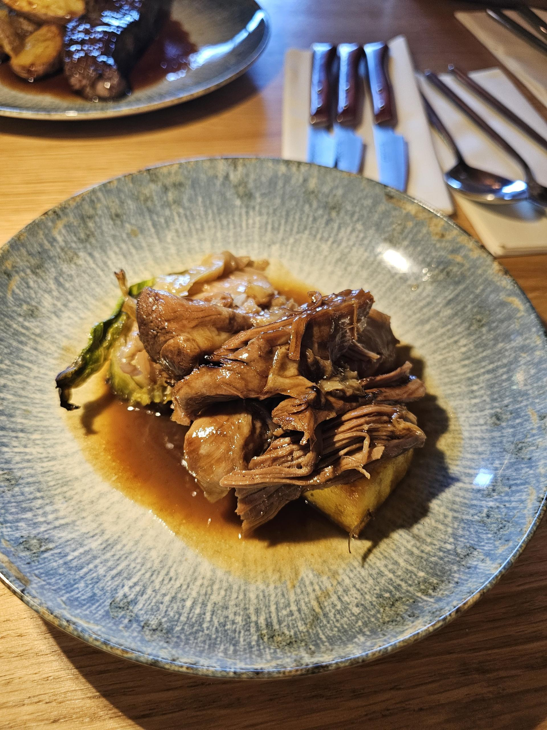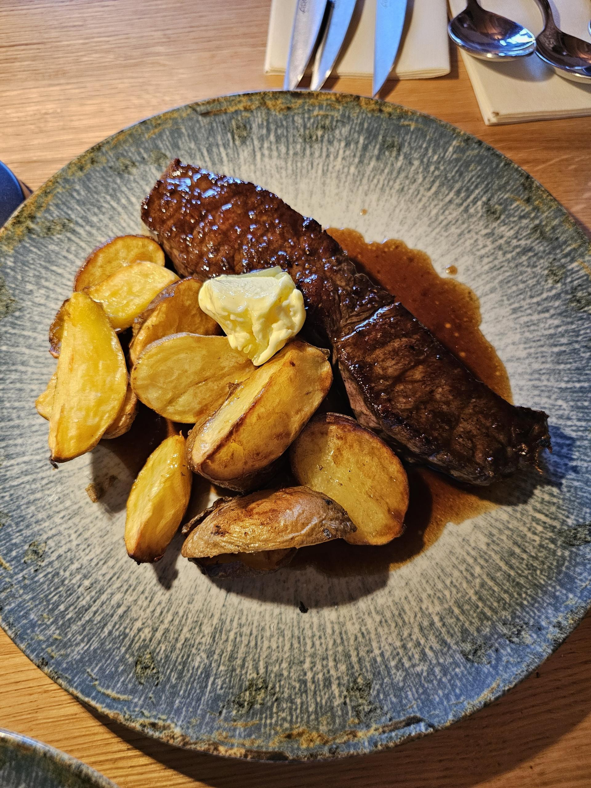Ramstek je mokro odležan 38 dana, tehnički perfektno pripremljen i poslužen s maslacem od vriska i domaćim krumpirom pečenim u kori uz isti umak koji je poslužen uz biftek. Osim fantastičnog krumpira, ovo jelo dodatno diže maslac od vriska s vrlo suptilnim cvjetnim notama.