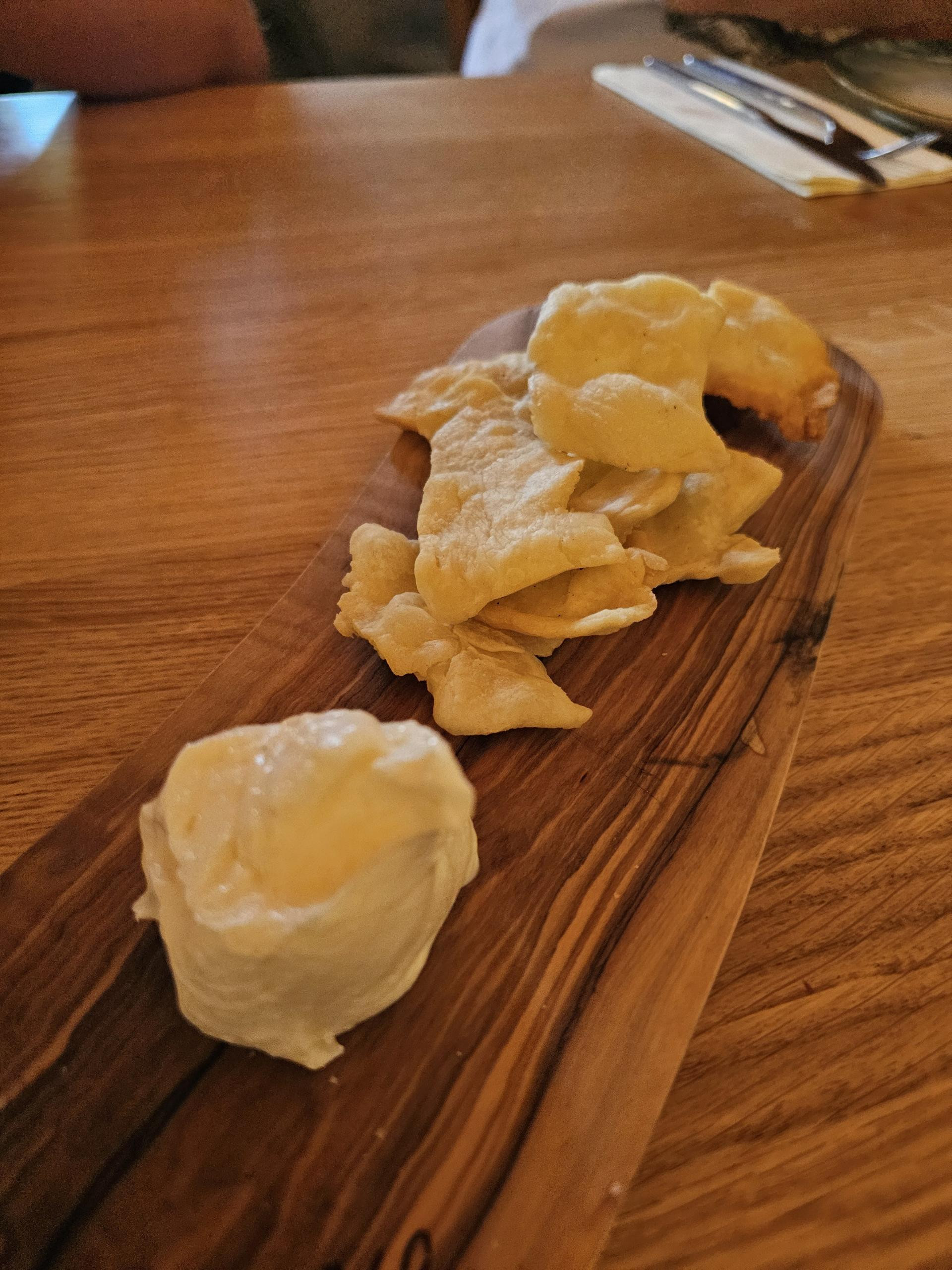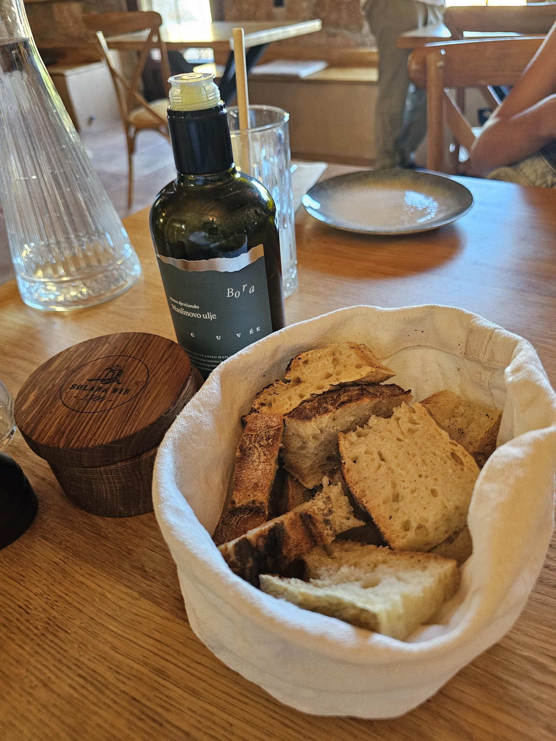 Dok smo čekali prvu hranu, na stol nam je stigao još topao kruh pečen pod pekom, maslinovo ulje vinarije Bora iz Posedarja i cvijet soli iz Ninske solane. Kruh je bio apsolutno fantastičan, pravi kruh ispod peke koji nas je katapultirao u posjete rodbini u Dalmatinskoj zagori, a solidno ulje mu nikako nije odmoglo.