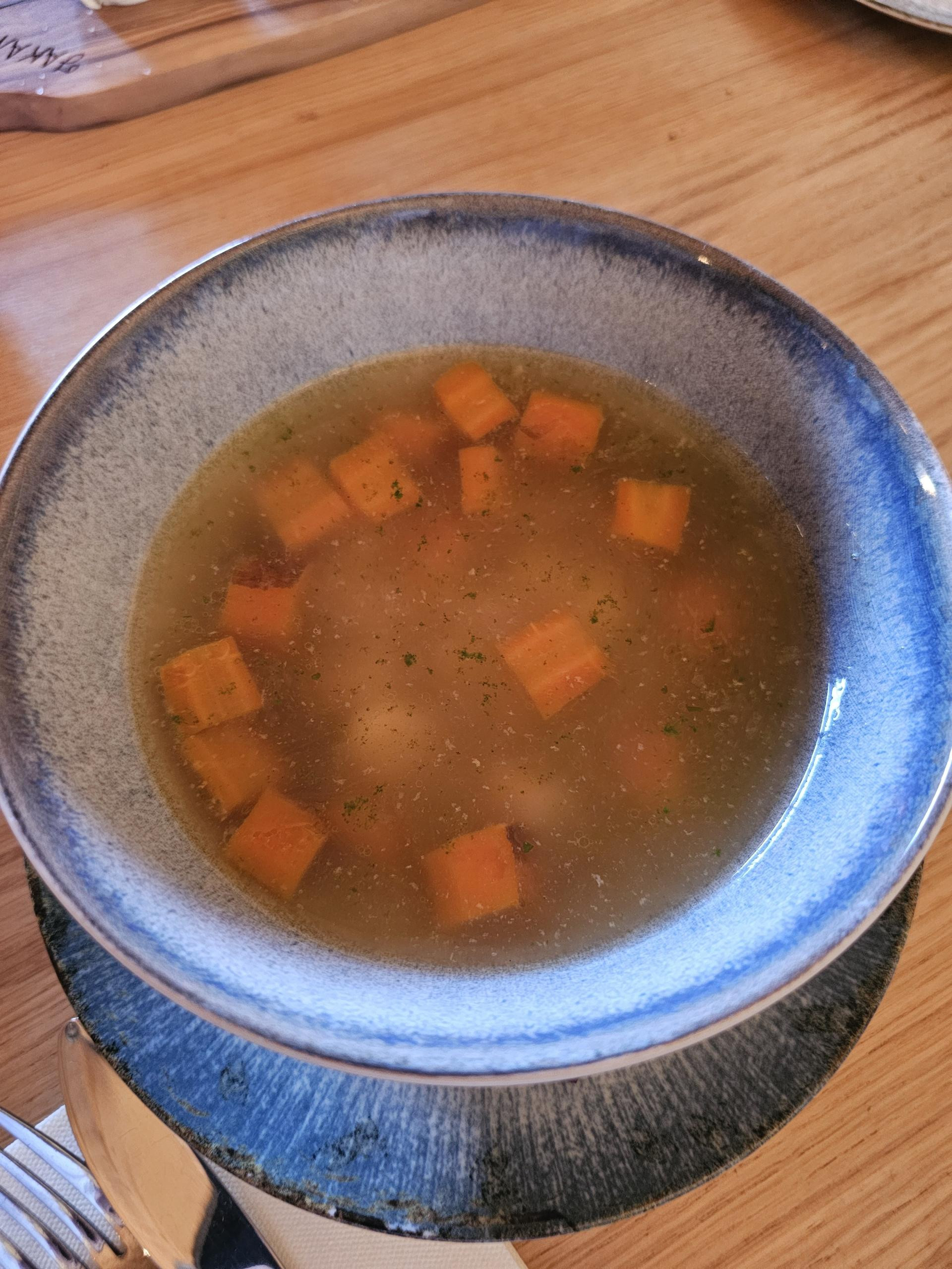 Jelovnik je kratak, tek 12 slanih jela i dva deserta, tako da smo za predjelo odabrali slane uštipke s ličkom basom (9 €) i tartarski odrezak (19 €) i juhu od pivca (6 €).