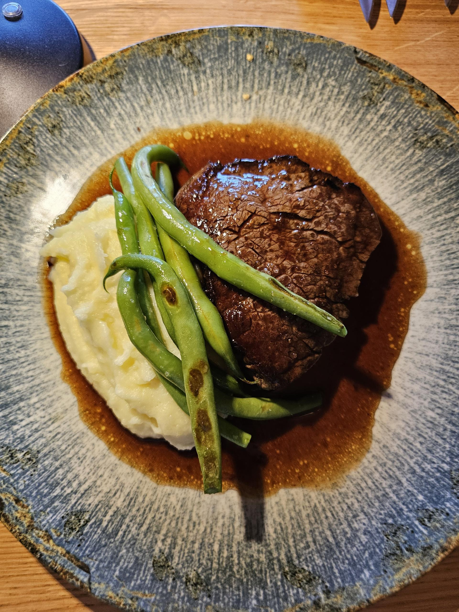 BIftek je poslužen s blanširanim i lagano zaprženim mahunama, pire krumpirom i goveđim umakom. Na pitanje konobarice odabrali smo srednje-slabo pečen biftek što smo i dobili, a meso je bilo tehnički pečeno bez greške, mekano i ukusno, s izvrsnim umakom. Ali ono što nas je posebno oduševilo jest pire krumpir. Naime, ovo nije bila francuska verzija kremasta do savršenosti i dominantno mliječna okusom, ovo je verzija u kojoj tekstura nije savršeno glatka i u kojoj ćete osjetiti poneki komadić krumpira. Ali kakvog! Uglavnom, cijelim jelom dominirat će okus najboljeg krumpira s mliječnom podlogom u pozadini, a komadići koji bi nekome mogli smetati nama su bili kao bingo. I odličan primjer kako i u klasičnom jelu sadržaj može zasjeniti formu.