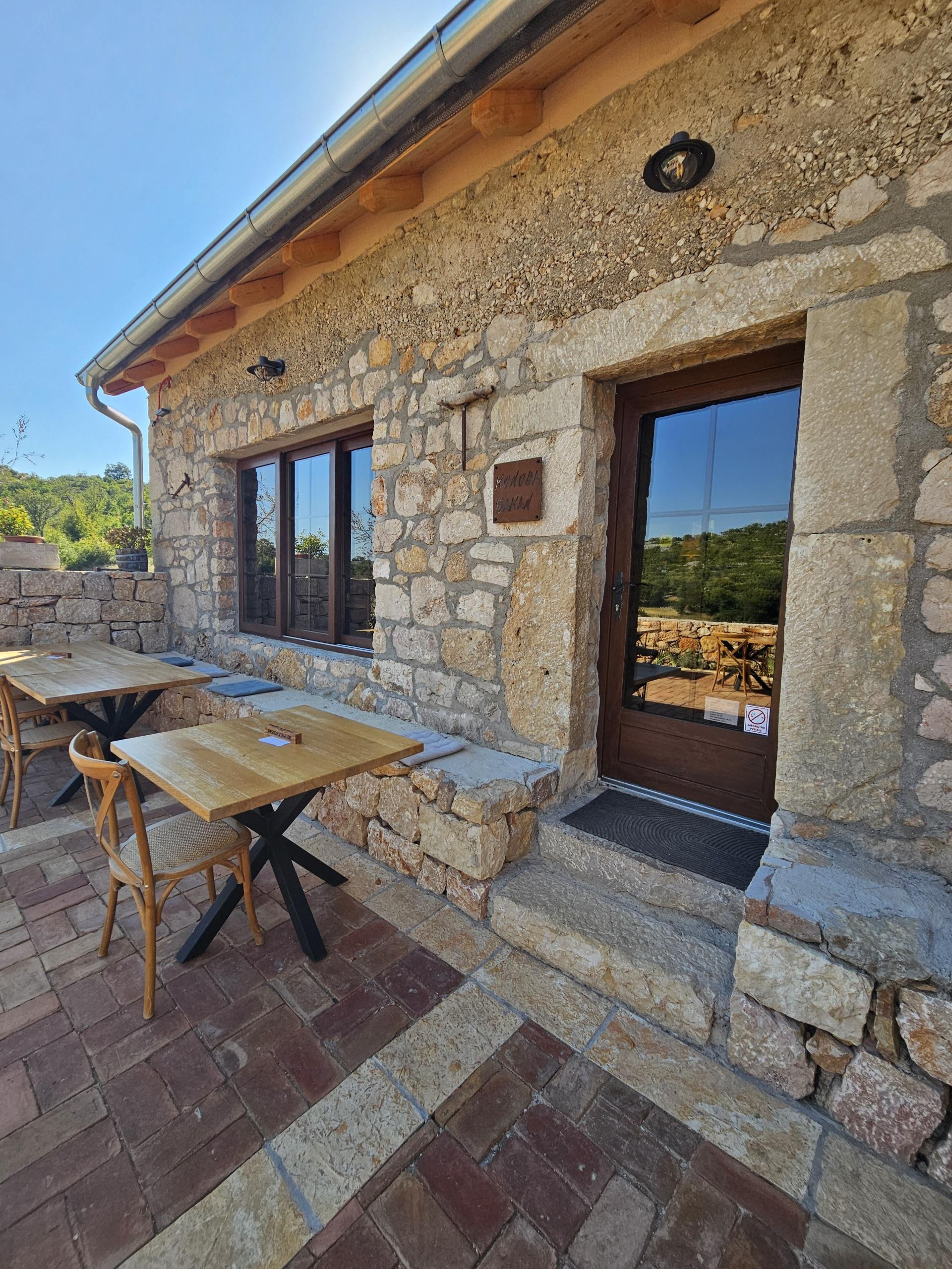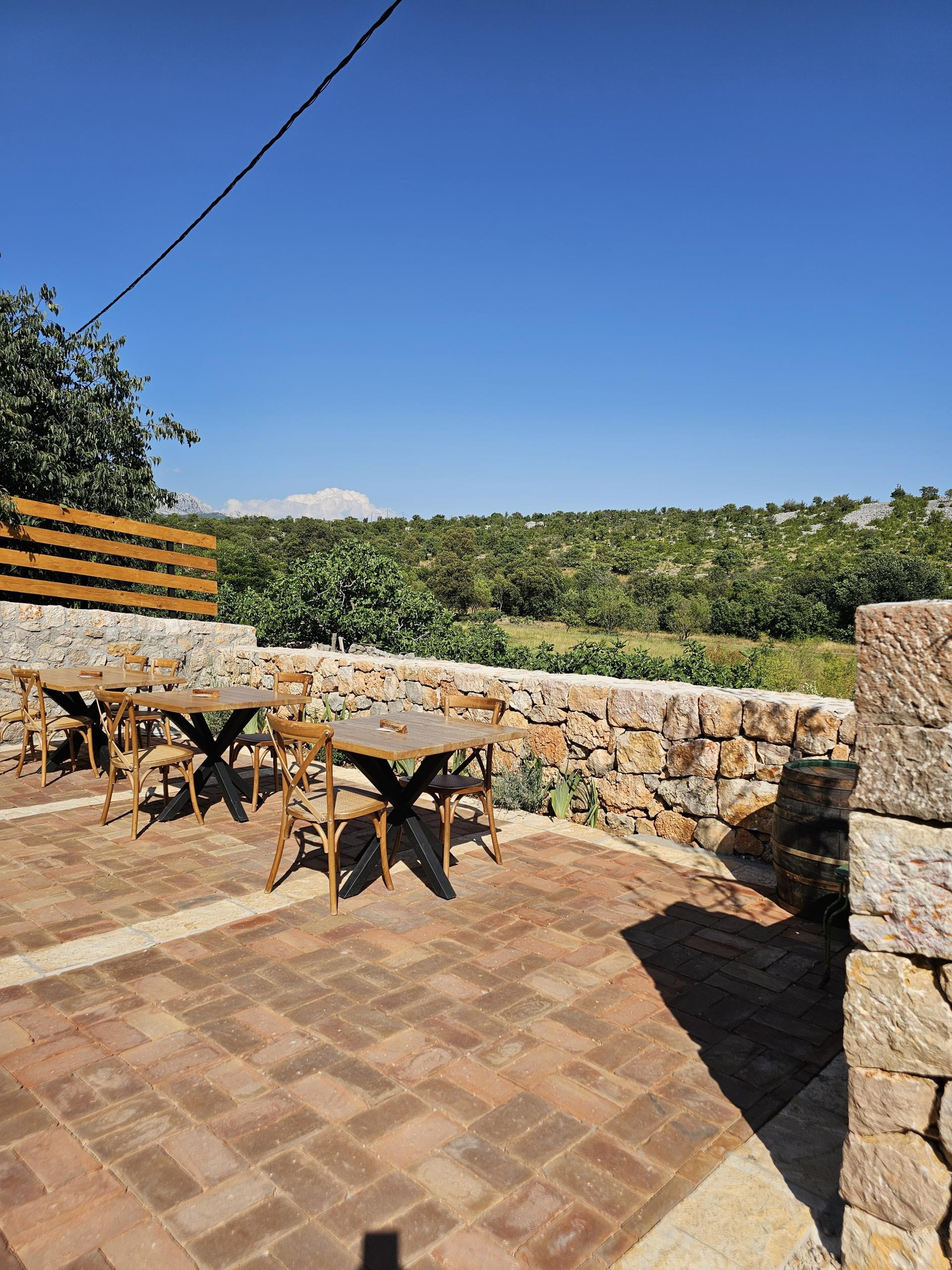 Ispred restorana nalazi se mala terasa, za ovo podneblje vrlo neobično flastrovana (popločena) ciglom (opekom), s pogledom na polje i okolna brda, ali smo s obzirom na vrućinu stol uzeli u vrlo ugodnoj unutrašnjosti konobe. Središnji dio konobe je šank iza kojeg se nalazi veliki uzdignuti komin, a prostor je uređen suvremeno s etno detaljima. Posebno su nam se svidjele uokvirene rukom pisane poruke na zidovima koje je napisala samouka baba Manda, matrijarh obitelji i baka generacije koja vodi restoran.