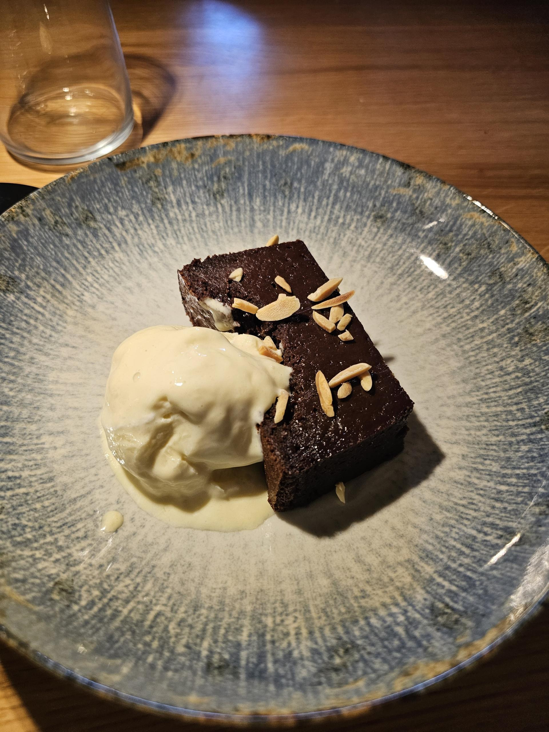 Međutim, čokoladni kolač i sladoled od meda su nas oborili s nogu. Čokoladni kolač jedan je od najboljih koji smo ikada probali, punog okusa čokolade, nježne i lagane teksture koja se gotovo topi u ustima, a opet ne gnjecav. Spoj sa sladoledom od meda funkcionira idealno, jer iako smo se bojali da će biti presladak, uopće nije bio, a okus meda je bio dominantan, ali ne na agresivan način i savršeno se slagao s kolačem.