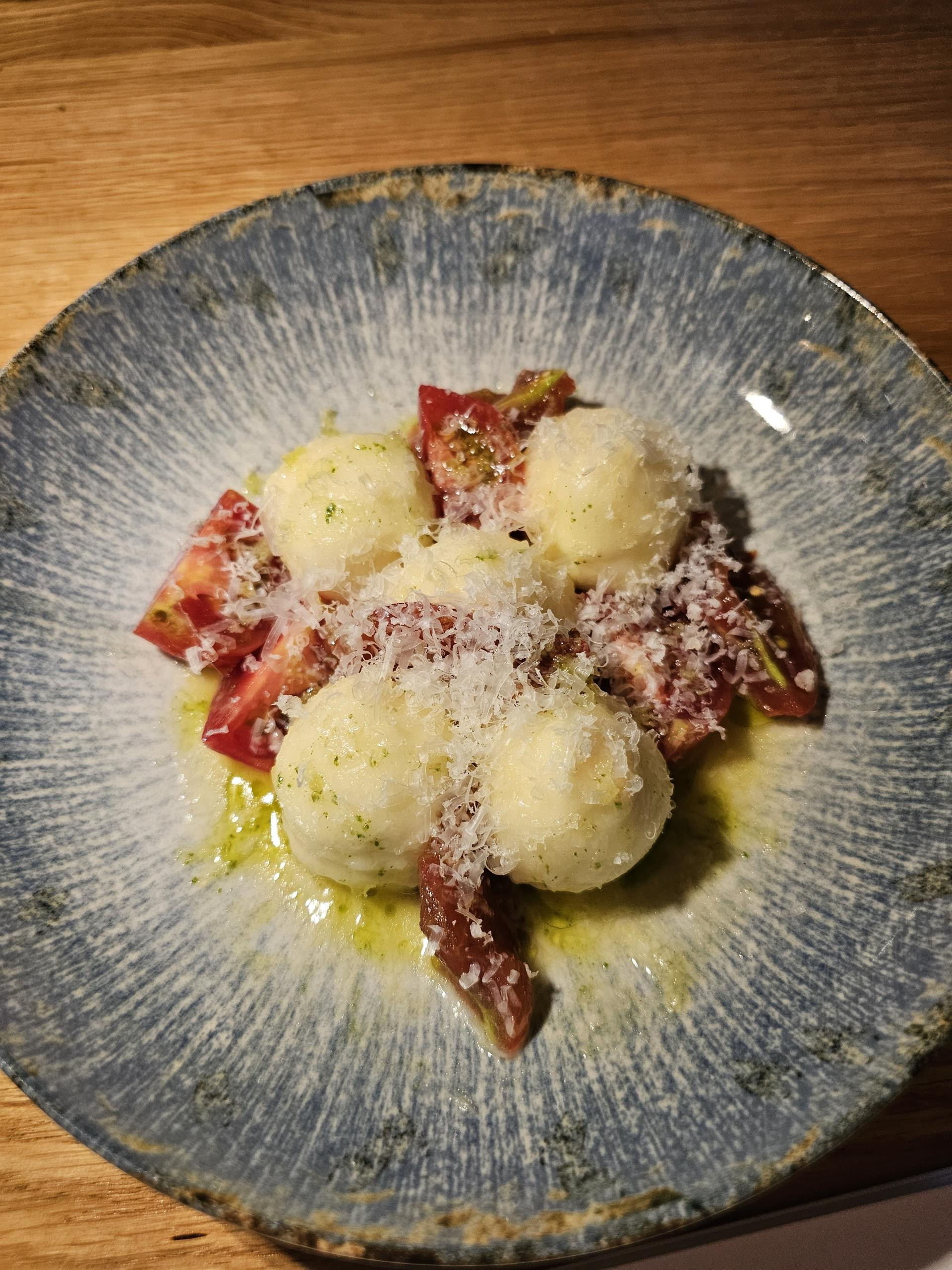Gnudi (njudi), mekši i lakši rođaci gnoccha (njoka), rade se, umjesto s ricottom, s paškom skutom (oba se sira rade od sirutke, ali se u ricottu dodaje mlijeko ili vrhnje), još jedan mig lokalnim namirnicama i još jedna uspješna kombinacija, pogotovo što je posuta s još malo sira iz mišine koji jako lijepo komplimentira skutu. Pečene i oguljene cherry rajčice daju notu svježine i slatkoće.