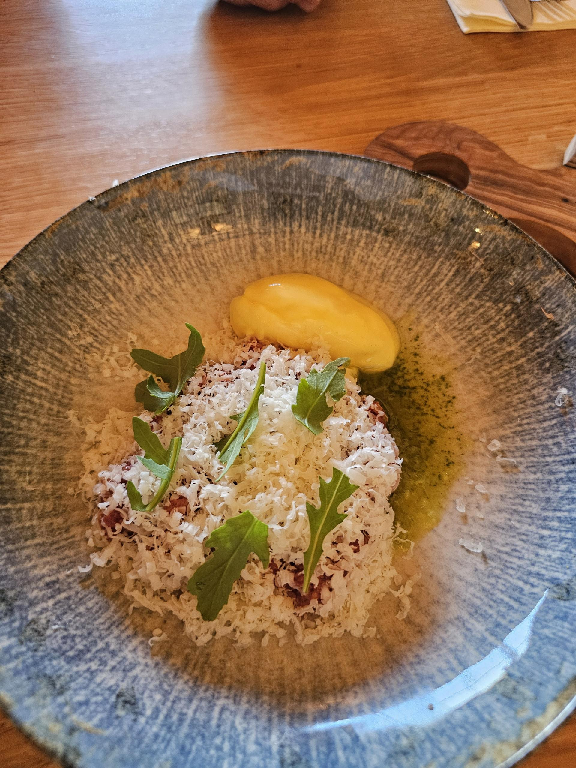 Tartarskom smo se posebno veselili s obzirom na to da se služi sa sirom iz mišine (uz dodatak domaćeg dimljenog maslaca) i nismo ostali razočarani. Dobra hrana već je pisala o potencijalu sira iz mišine, a ovo je jelo pokazatelj da se radi o namirnici kojoj apsolutno treba dati više prostora. Meso je kosano i nešto blaže začinjeno jer je obilno posuto naribanim zrelijim sirom iz mišine, dobro popaprenim i uz žličnjak dimljenog maslaca. Uz kruh ispod peke i malo maslinova ulja, ovo je jedna od najboljih verzija tartarskog koji smo probali, jer sir ovdje upravo pjeva i fantastično se slaže sa svježim mesom. Jedina zamjerka ide na par listića rukole koja je po našem mišljenju ovom jelu apsolutno nepotrebna.