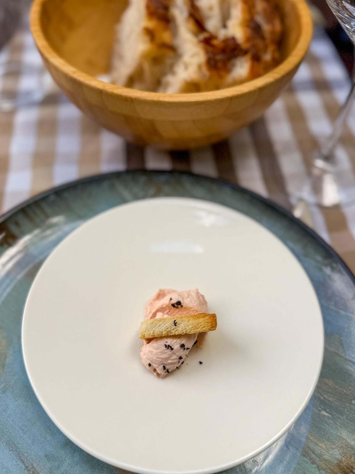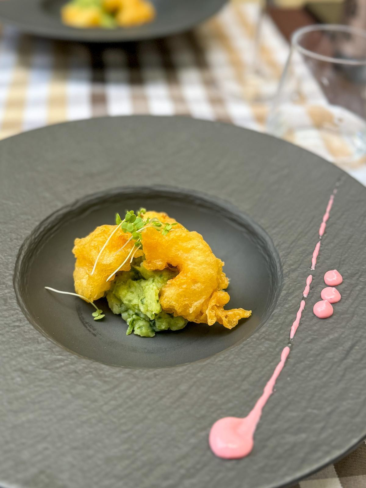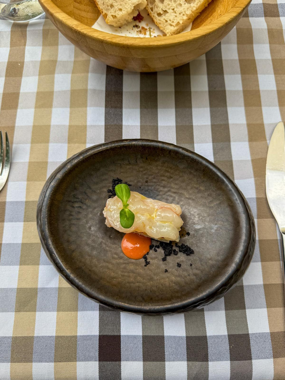 Zatim nas je konobar iznenadio međuslijedom: prepečena skuta s mariniranim škampom i gazpachom od pečene paprike. Odlično, gotovo hrskavo i blago pikantno. Škamp je bio fantastično mariniran. Uz međuslijed smo dobili i kapljicu Coletti Sivog pinota iz 2024.