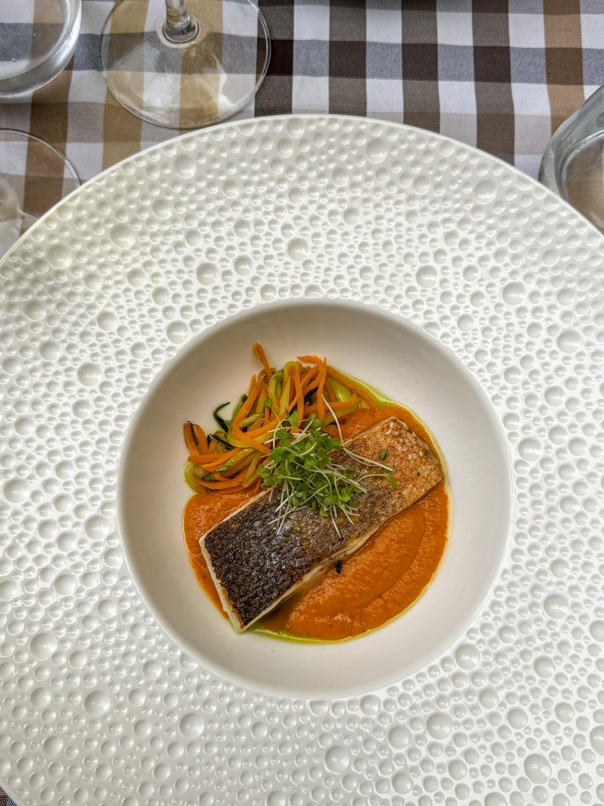 Četvrti slijed čini filet brancina na pireu od mrkve, poslužen uz julienne sotirano povrće. Vrlo lagano jelo, brancin je bio nadasve svjež i odlično pečen, pire vrlo nježan i prozračan, a povrće blago hrskavo. Uz ribu smo pili fantastičan Damjanić Clemente Blanc iz 2021., čije su cvjetne karakteristike i dug finiš odlično išle uz ribu.