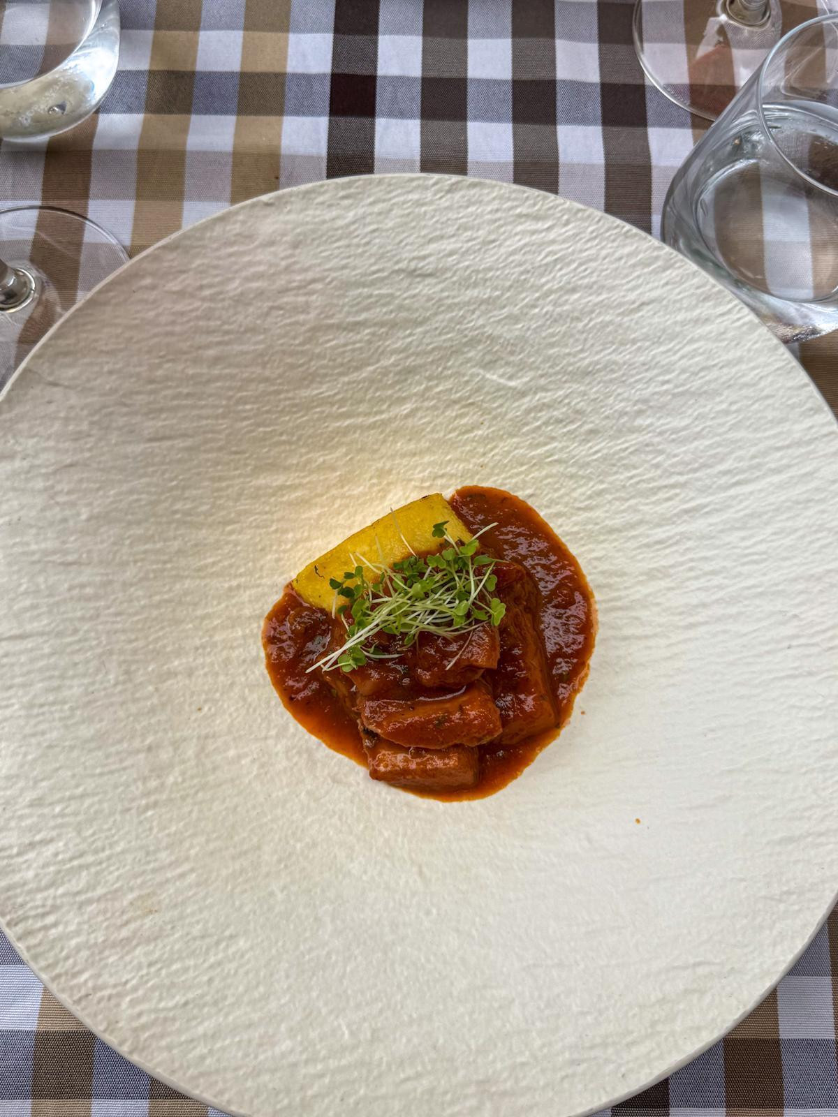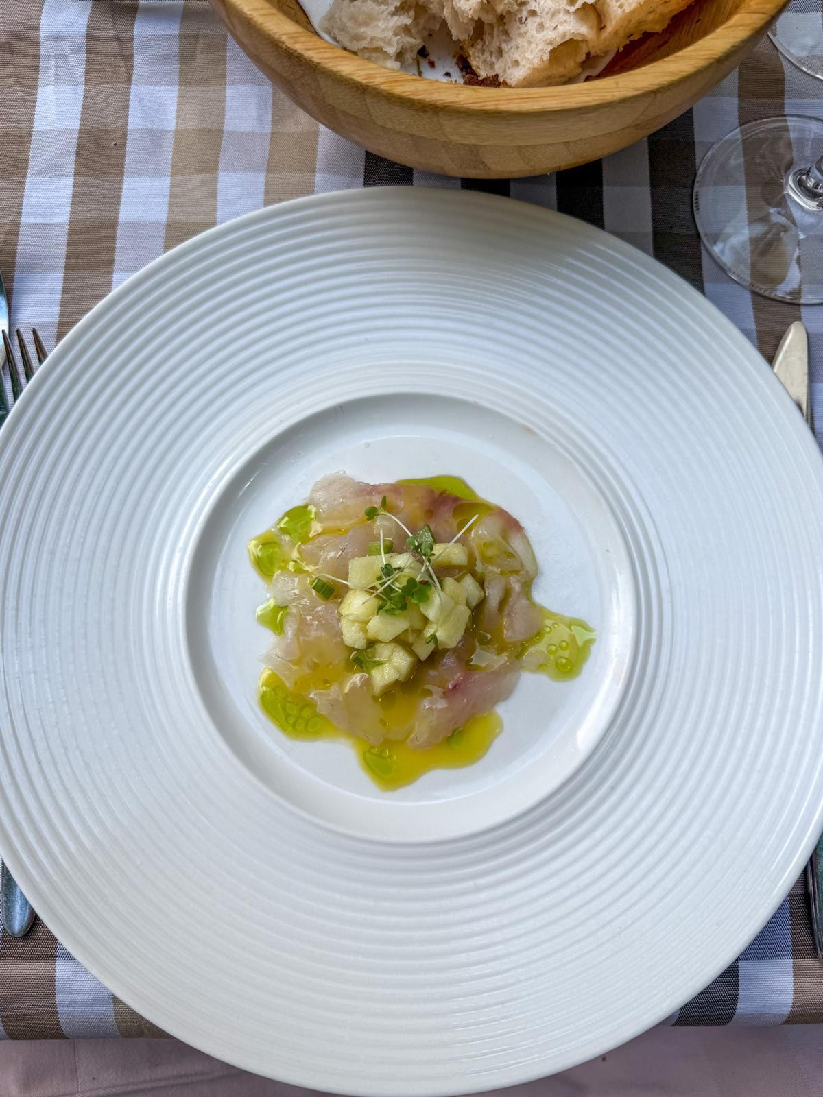 Prvi slijed činio je carpaccio od brancina s citrusnom emulzijom i hladnom salatom od jabuke i celera. Jednostavno jelo, lijepo prezentirano s puno okusa. Ulje od peršina lijepo se sljubilo s oštrinom ribe. Uz brancin smo pili mladi, svježi Sauvignon Franković iz 2024.