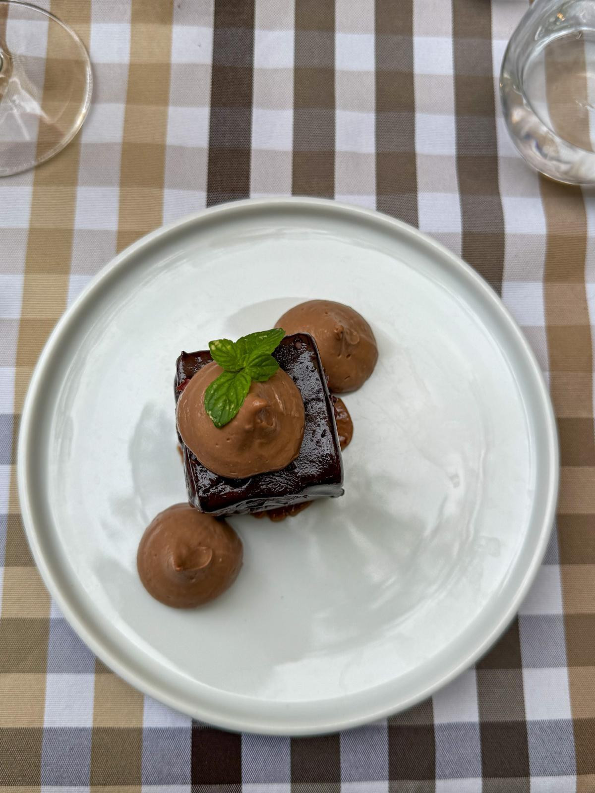 Posljednji slijed donio je moćnu dozu čokolade u obliku kolača i moussea. Iako je desert bio vješto pripremljen i prilično lagane teksture, smatramo da je takav intenzivan okus blagi promašaj za ljetni degustacijski meni, gdje bi laganija i svježija opcija bila puno prikladnija. Uz ovaj bogat desert poslužen je jednako tako bogat Piquentum Refošk.