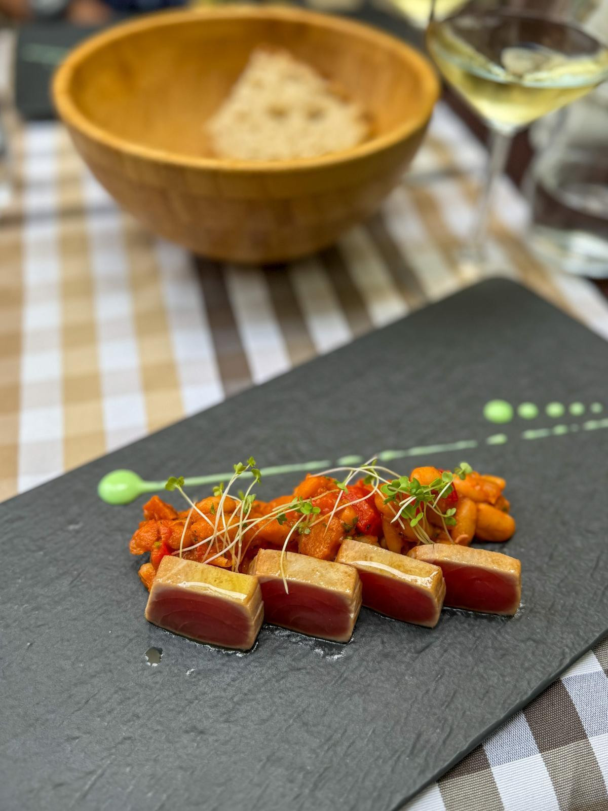Nakon kratke pauze stigao je drugi slijed: hladan tuna tataki poslužen s toplom salatom od graha, pomidora i paprike te majonezom od wasabija. Iako je svaka komponenta za sebe bila izvrsno pripremljena, posebno ukusna topla salata, jelu je nedostajalo kohezije. Nismo osjetili da se elementi međusobno nadopunjuju i stvaraju zaokruženu cjelinu na tanjuru. Uz drugi smo slijed pili svježu Malvaziju Coronica.