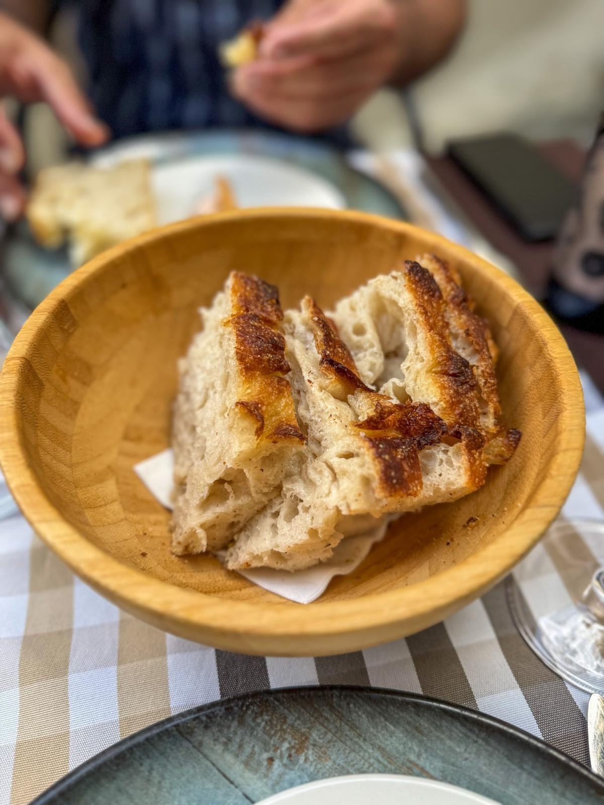 Večer je započela s pozdravom iz kuhinje u obliku domaćeg svježeg sira s pomidorom i dehidriranim crnim maslinama. Vrlo dobro, pikantno. Domaći kiseli kruh, koji smo dobili uz pozdrav, bio je baš odličan – mekan i karakteran.