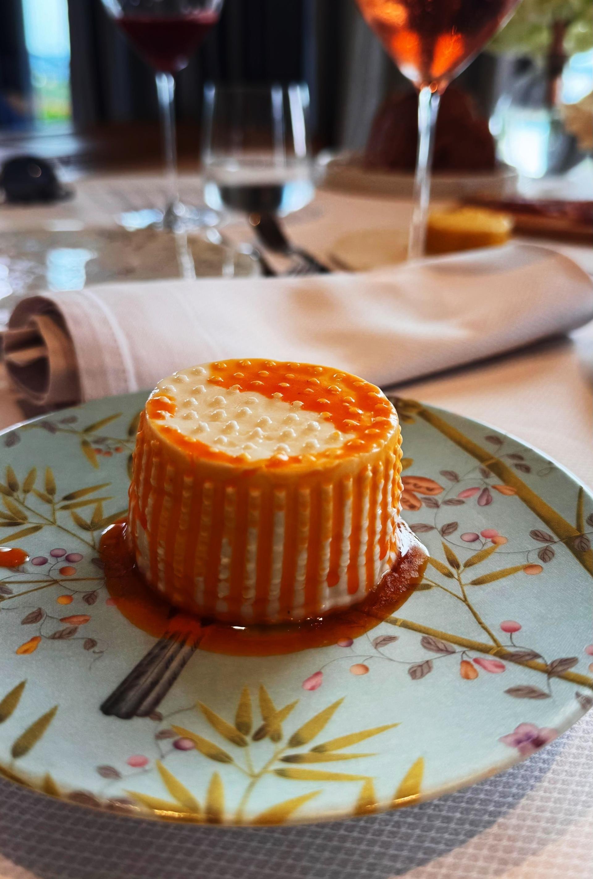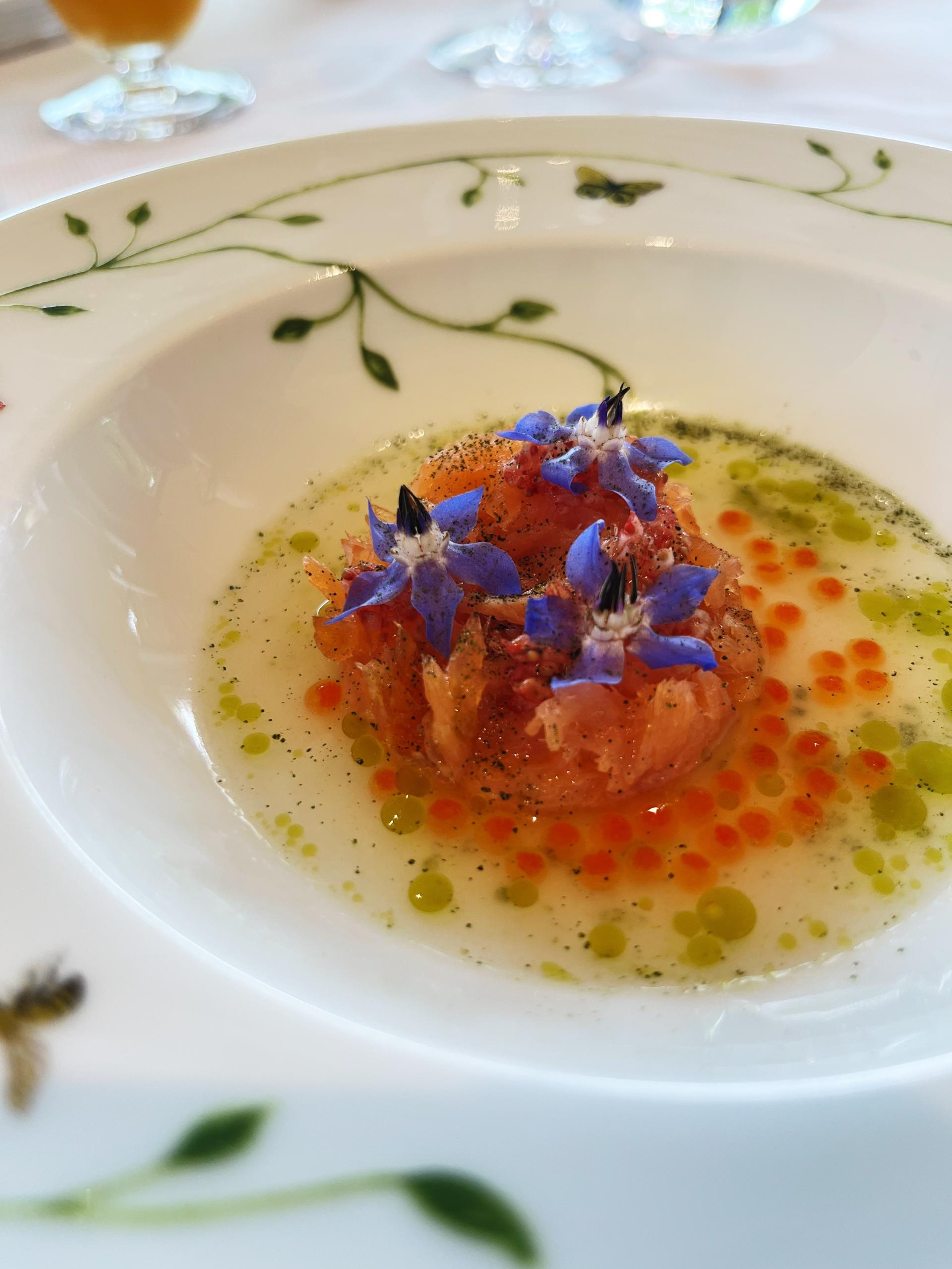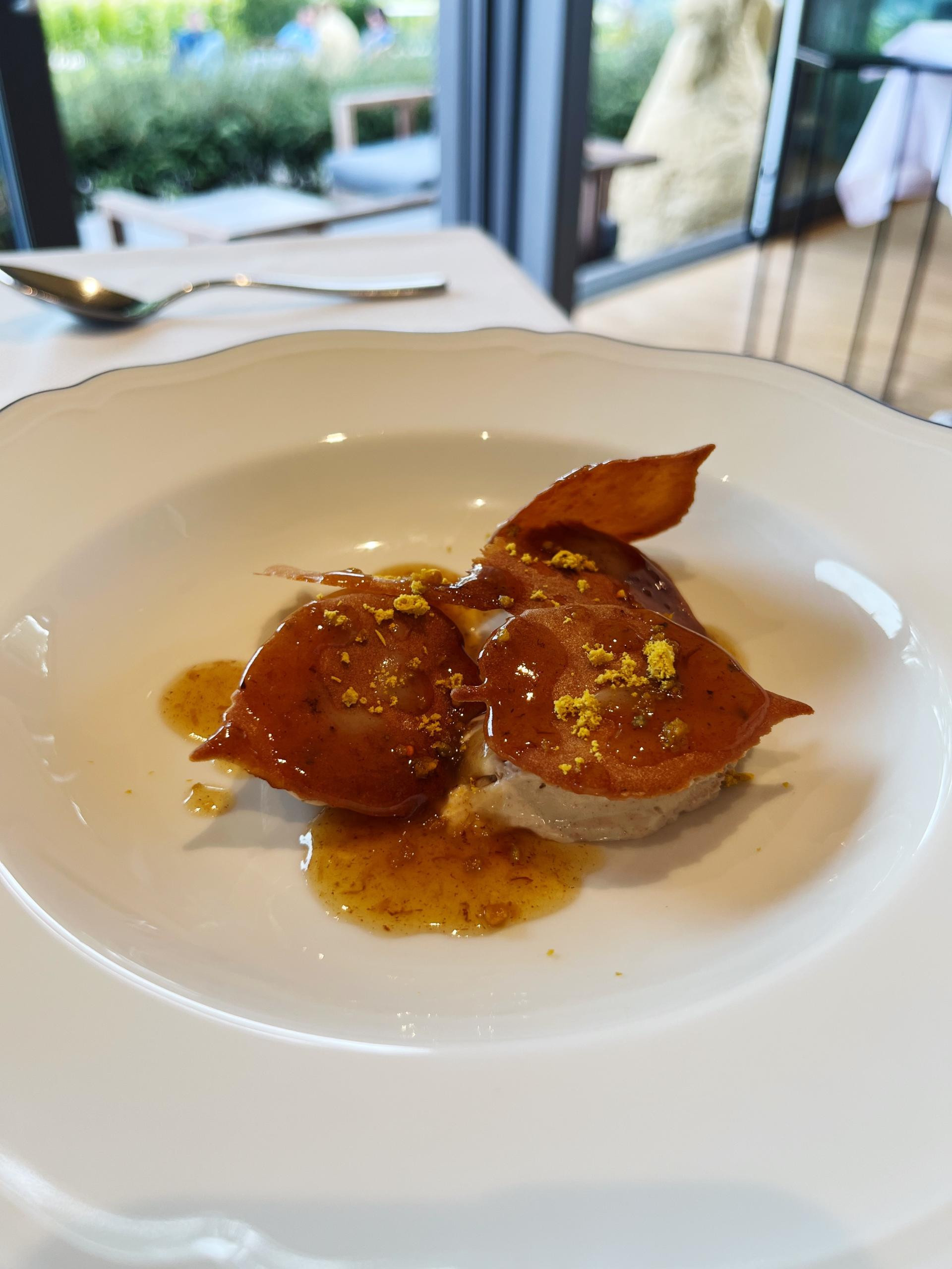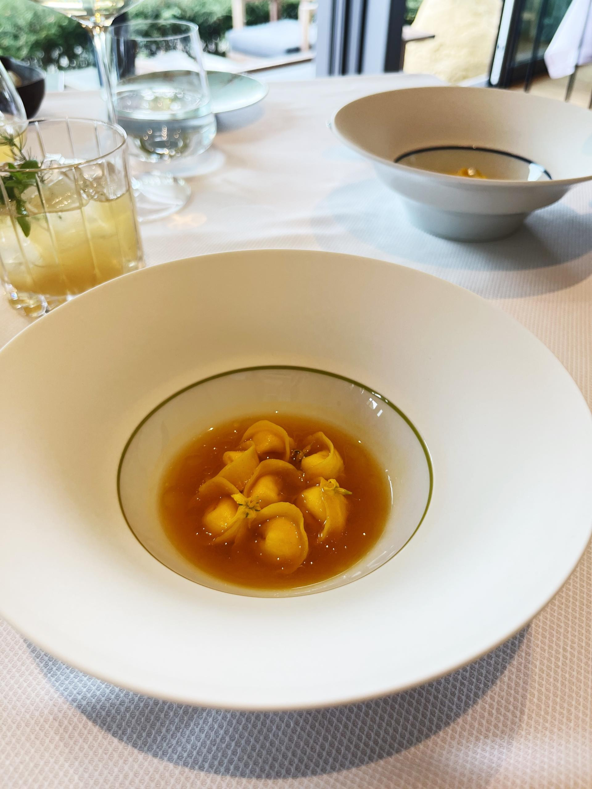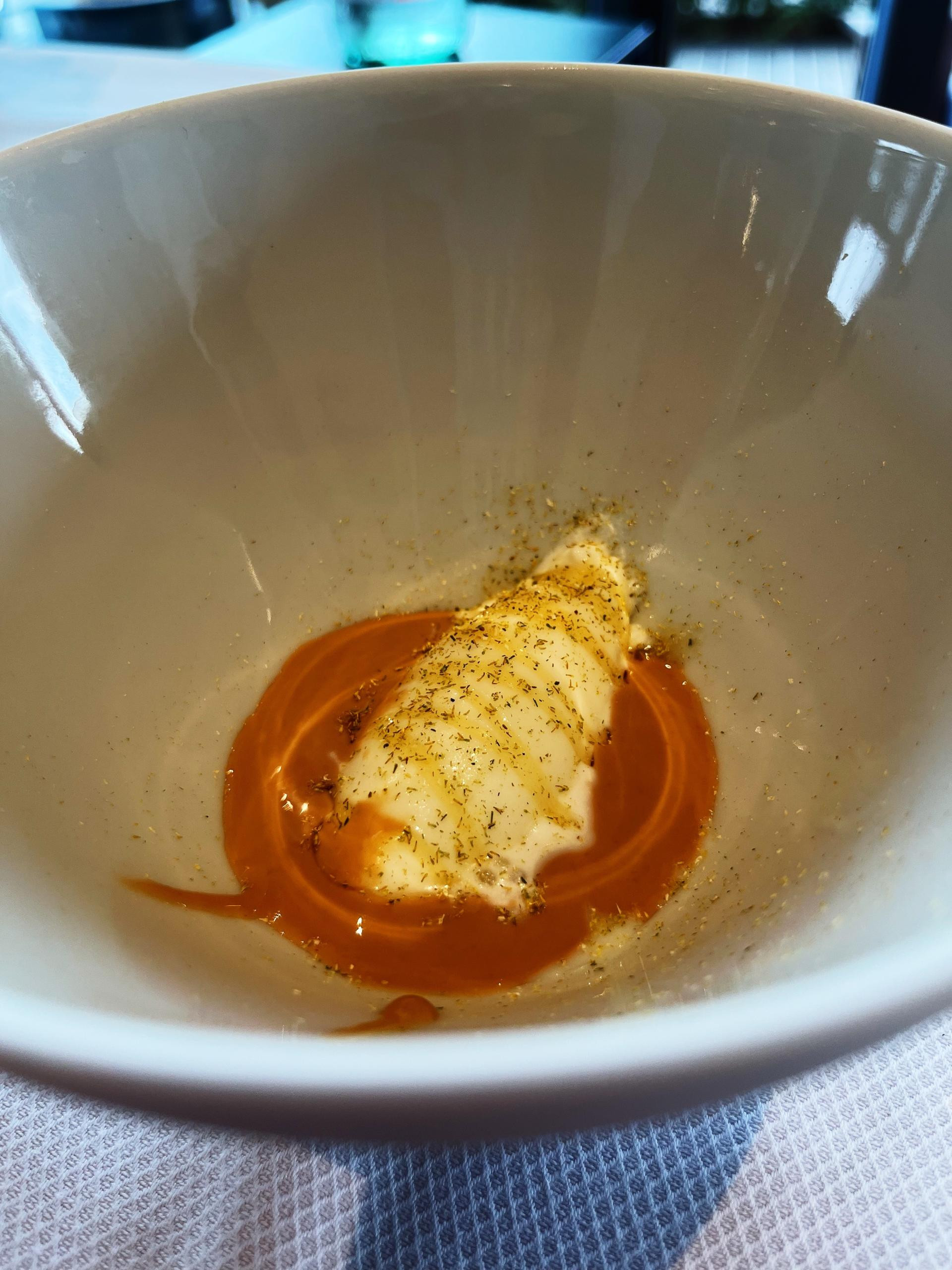 Novi slijed donio je novu priču. Napitak od verbene, bosiljka, kamilice iz vrta restorana lijepo je pratio jelo u kojem su u kuhinji spojili consomme od rajčice sa šafranom, cvjetove rajčice i raviole punjene skutom. Ovo jelo donijelo je toliko jednostavnosti u najljepšem obliku da smo na trenutak poželjeli da nikada ne završi. Topli consomme bio je prepun okusa, umamijast, a ravioli su tanjuru donijeli mekoću. Za one koji ljeto vole najviše zato što je to sezona rajčica, ovaj tanjur je sve što su sanjali, pa i malo više.
