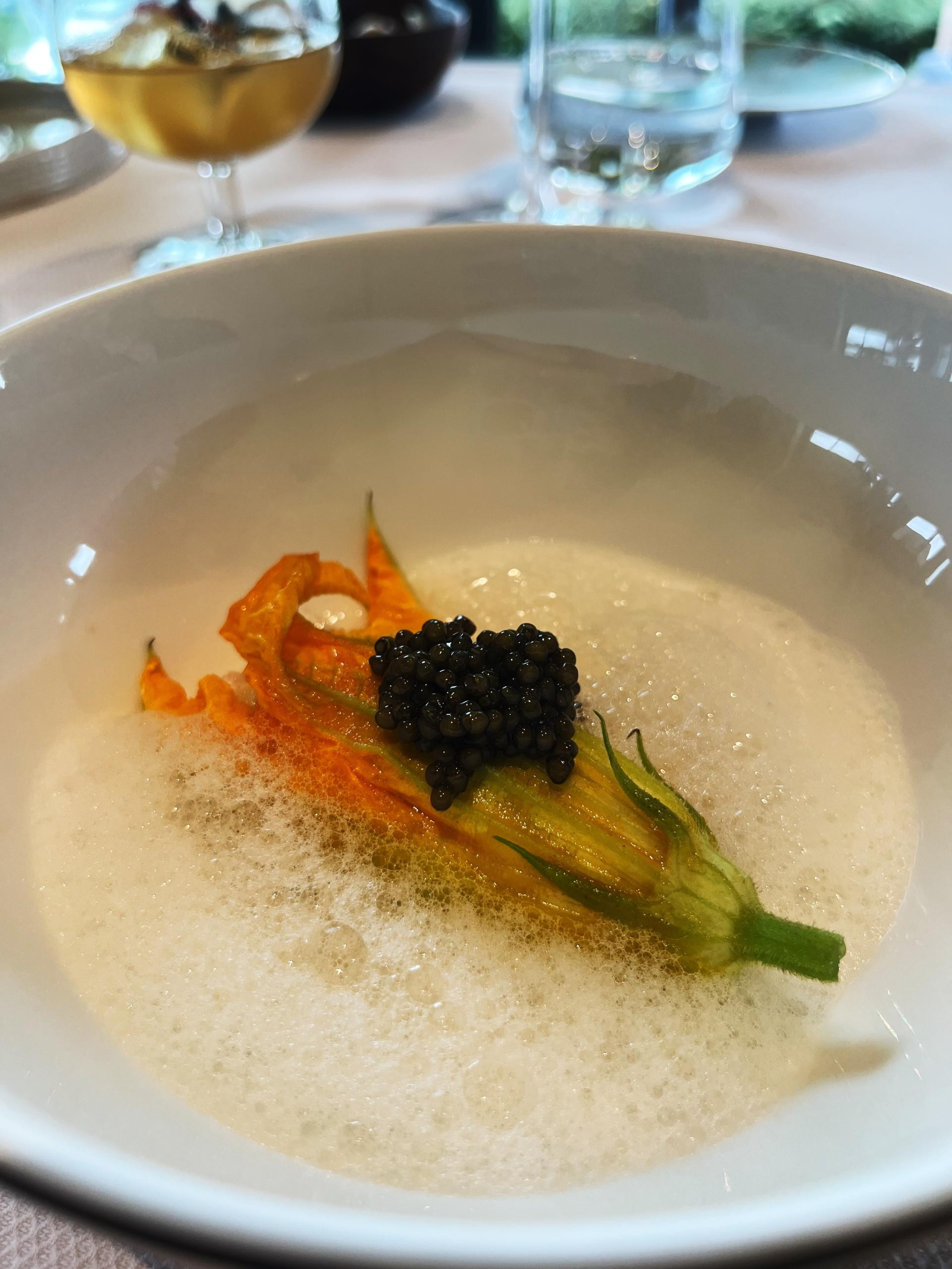 Na redu je bio cvijet tikvice punjen tartarom od tikvice i rakovice na humusu od badema, s pjenom od tikvice i usoljenog limuna, poslužen s kavijarom. Iako nam se jelo na prvu učinilo dosta nježnim, blaga pikantnost u humusu podigla ga je i zagrijala nas iznutra, a pjenica je imala svoju svrhu i blagom gorčinom, ali i svježinom zaokružila kombinaciju. S ovim slijedom poslužen nam je Salty Lemon, napitak od usoljenih limuna. Dio stola bio je zbilja oduševljen ovom kombinacijom, slanoćom i dubinom, ali i slojevitošću koju je spoj napitka i jela stvorio u ustima svakom novim zalogajem i gutljajem.