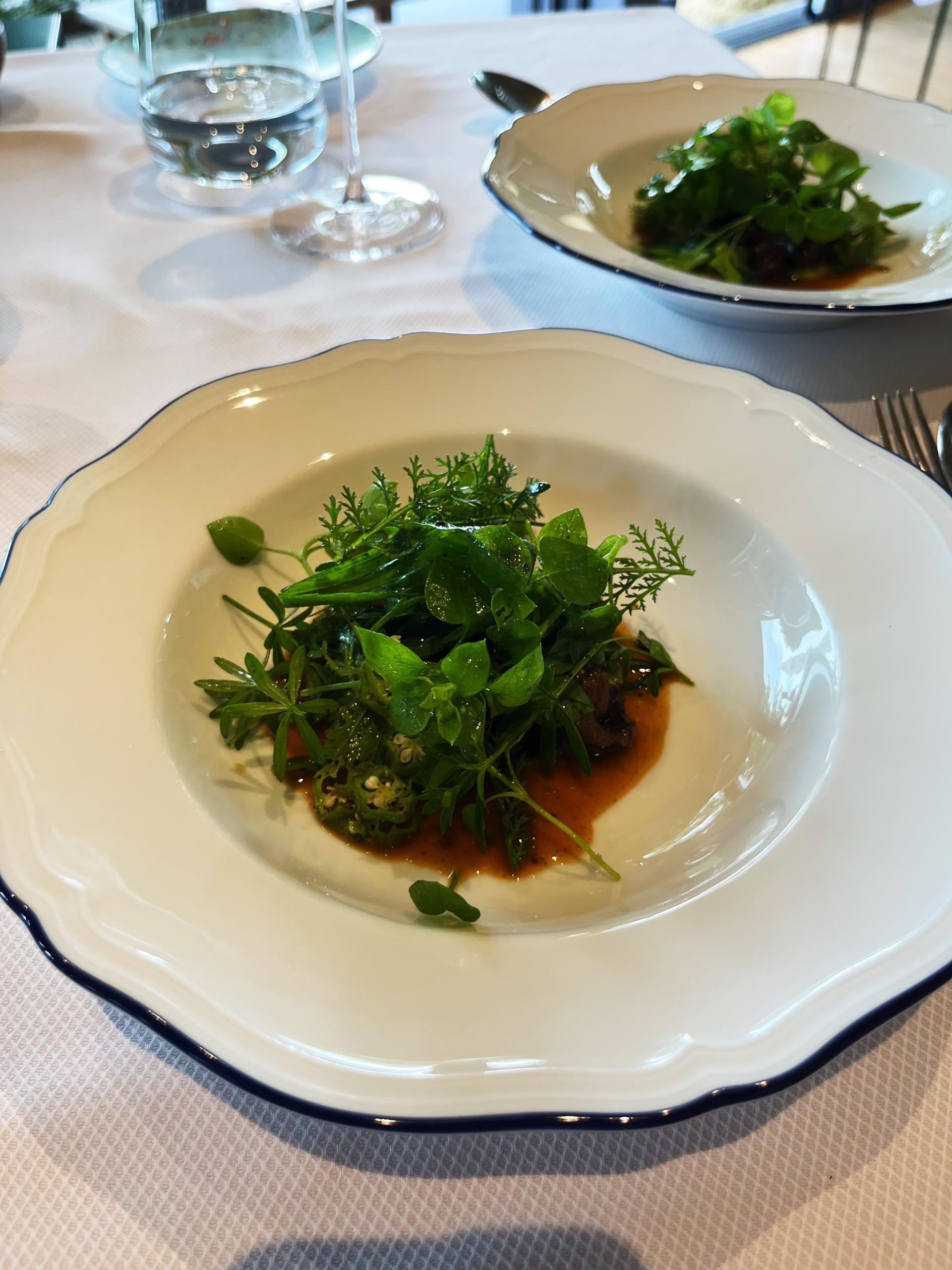 Nakon utješne rajčice s tjesteninom, stiglo je nešto ozbiljnije. Najprije bezalkoholni Negroni, napravljen od vermuta, marinirane borovice, kardamoma, sušenih smokvi i naranči i kamilice. Ozbiljan, s lijepom notom dima. A onda i puževi u raguu od kozlića s pestom od pistacija i samoniklog bilja, s mariniranim biljem i bamijom. Eksplozija okusa u ustima. Papreno taman do granice da ne postane previše. Jako, bogato, slasno i idealno uz blago gorkasti napitak.