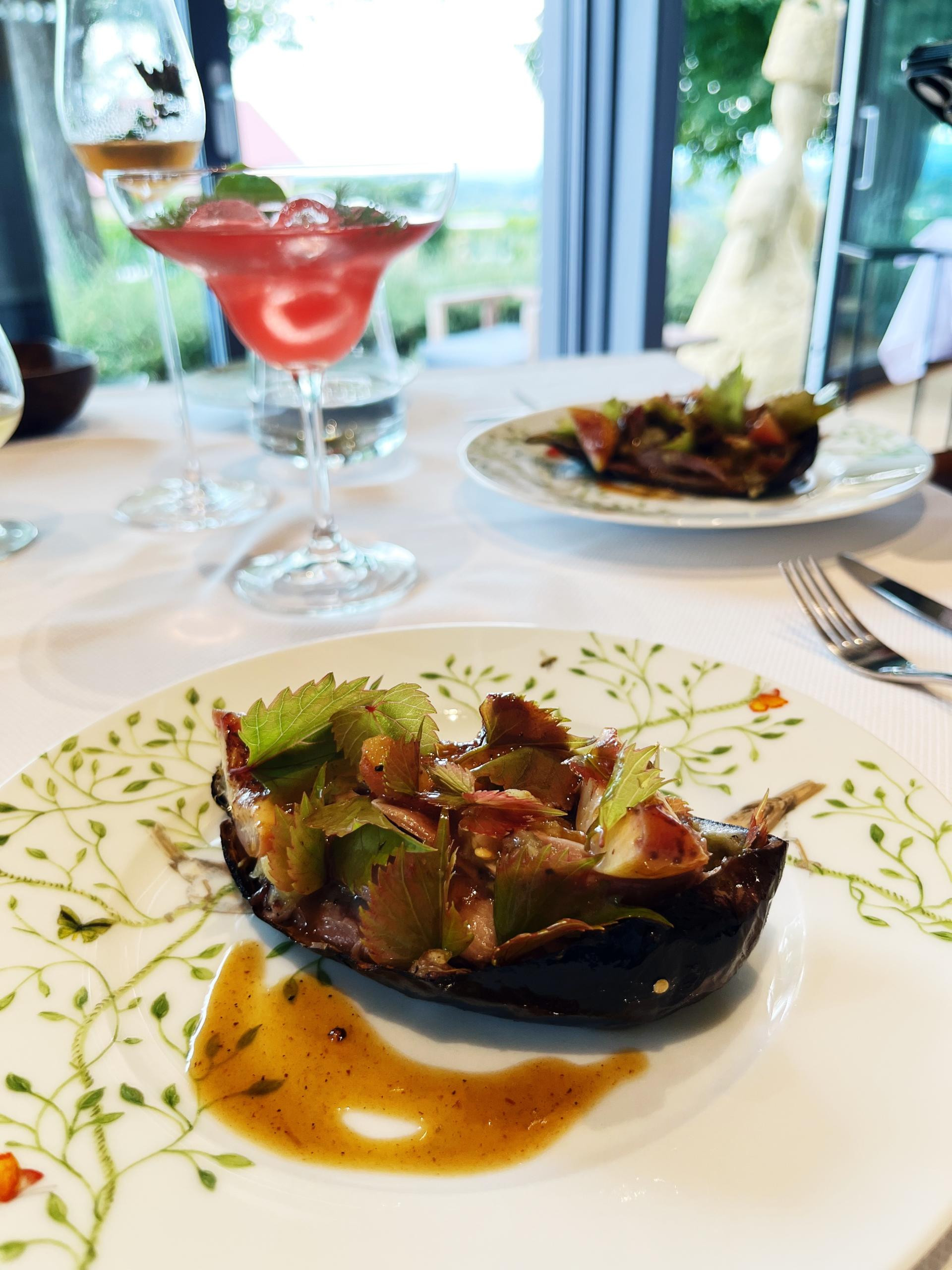 Poslije puževa, na redu je bio pečeni patlidžan punjen mesom od patlidžana i kozlića, s vinogradarskim breskvama, listićima divlje loze i umakom od pečenja s oskorušom. Blago ljutkasto, moćno, pomalo teško, ali ne na način da poželite otkopčati gumb na hlačama, već da poželite pojesti još samo jedan zalogaj. Jako aromatično jelo koje je odlično popratio koktel s gorkom narančom s Korčule, cordialom od limete i tonikom od grejpa. Ovaj nam se napitak učinio najobičnijim od svih koje smo isprobali, ali i dalje je u ustima stvorio lijepu igru okusa, bio je lagan i svjež, lijepo izbalansiran.