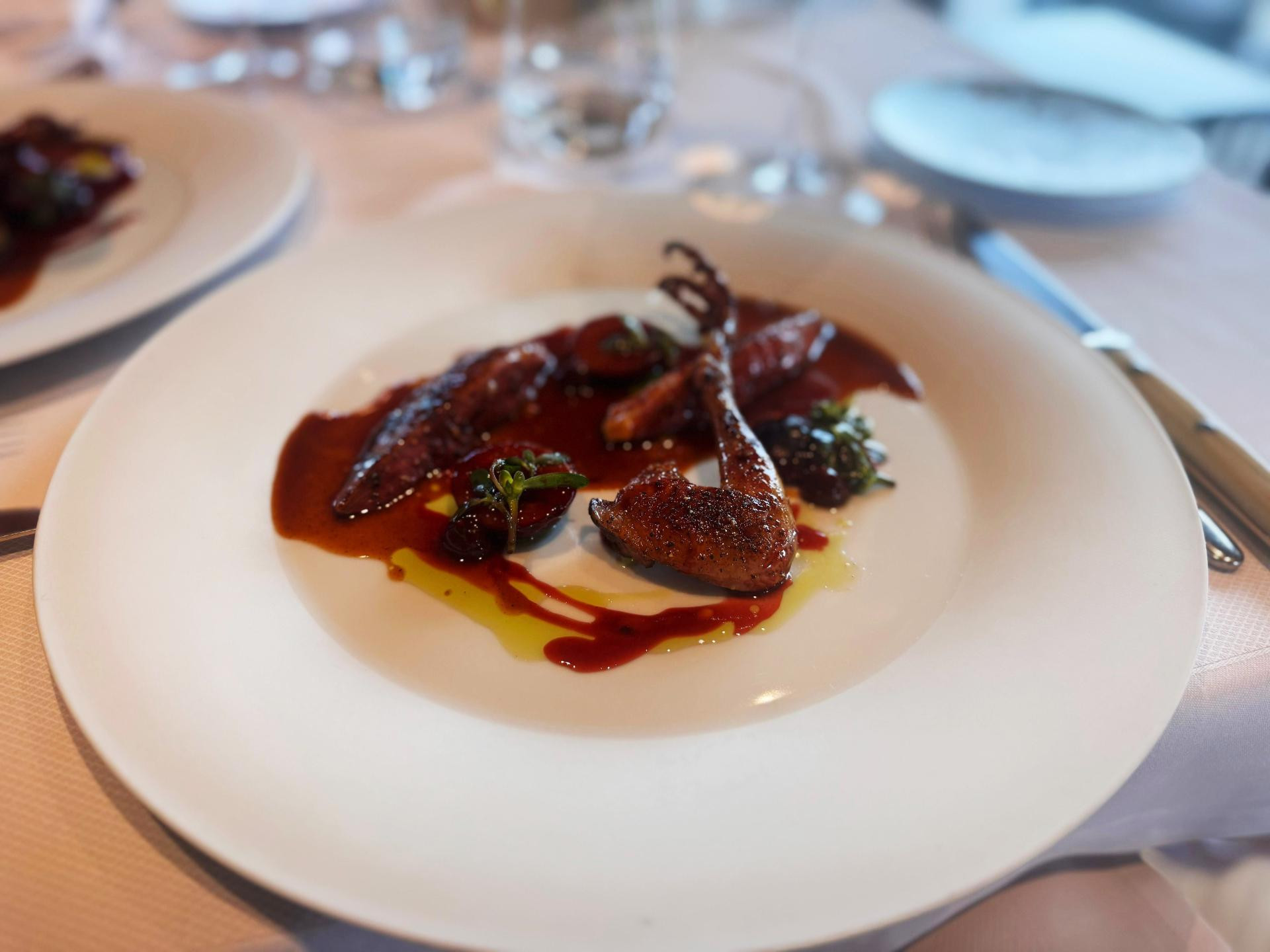 Uz glavno jelo, poslužen nam je crni pinot bez alkohola kojem, kako su nam rekli, nije cilj imitirati vino, već uhvatiti njegovu suštinu kroz esencije, pažljivo birane sastojke koji zajedno donose doživljaj crnog pinota, ali na potpuno drugačiji način. Ovo na jeziku hrskavo, svježe, pomalo trpko, ali ugodno piće rade od kvasca, crnog čaja, vinskog octa, aronije, soka od rizlinga i esencije hrasta i zbilja na jeziku predstavlja lijepo iznenađenje koje podsjeća na nešto poznato, ali pruža sasvim novi doživljaj. Glavno jelo bio je golub glaziran medom i cvijetom soli, poslužen sa šljivom bistricom, uljem od dragoljuba i umakom od pečenja. Golub je bio lijepo obrađen, ostao je sočan i odlično se složio s pečenom šljivom punom slatkastog soka, ali ako niste navikli na okus goluba, nešto između pačjih prsa, piletine i jetrice, ovo jelo moglo bi vam biti previše intenzivno. Također, porcija je poprilično velika ako se u obzir uzme sve što smo pojeli do tada, pa smo se s ovim tanjurom na kraju malo i borili.